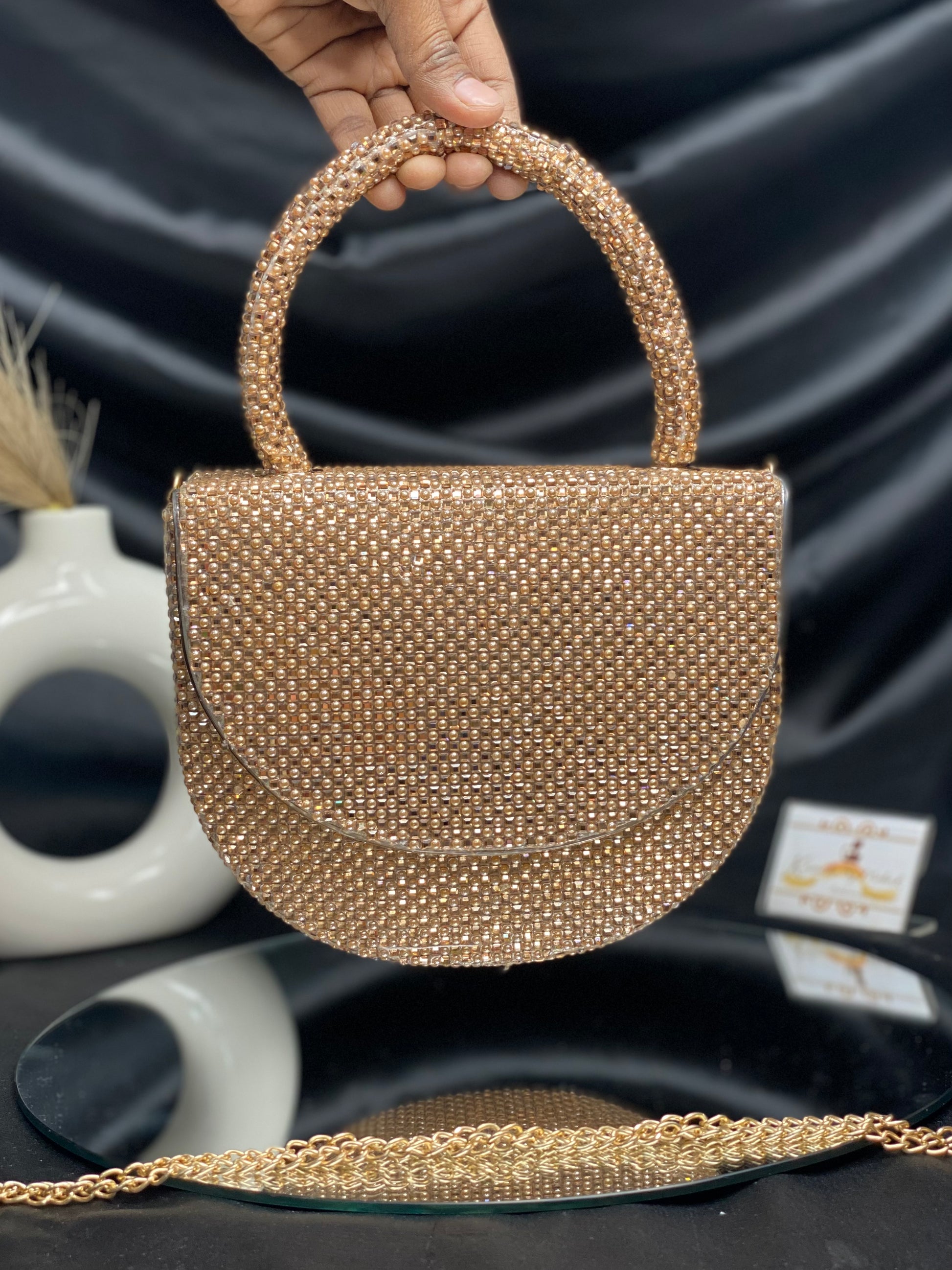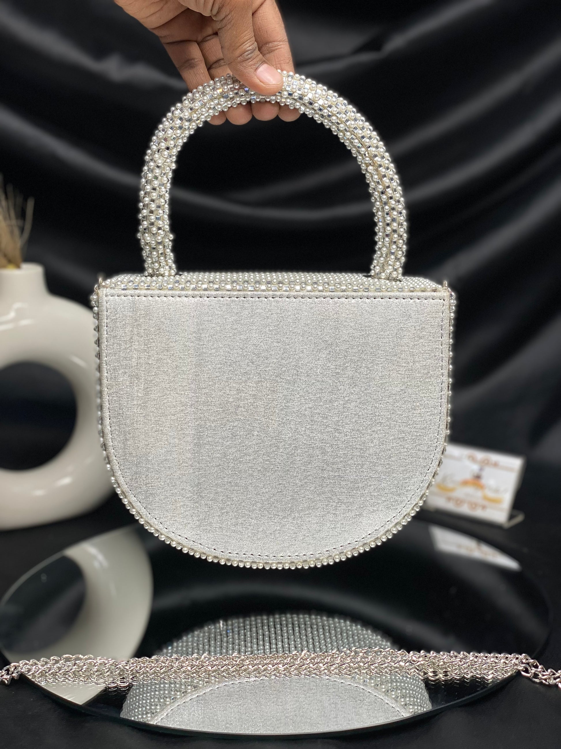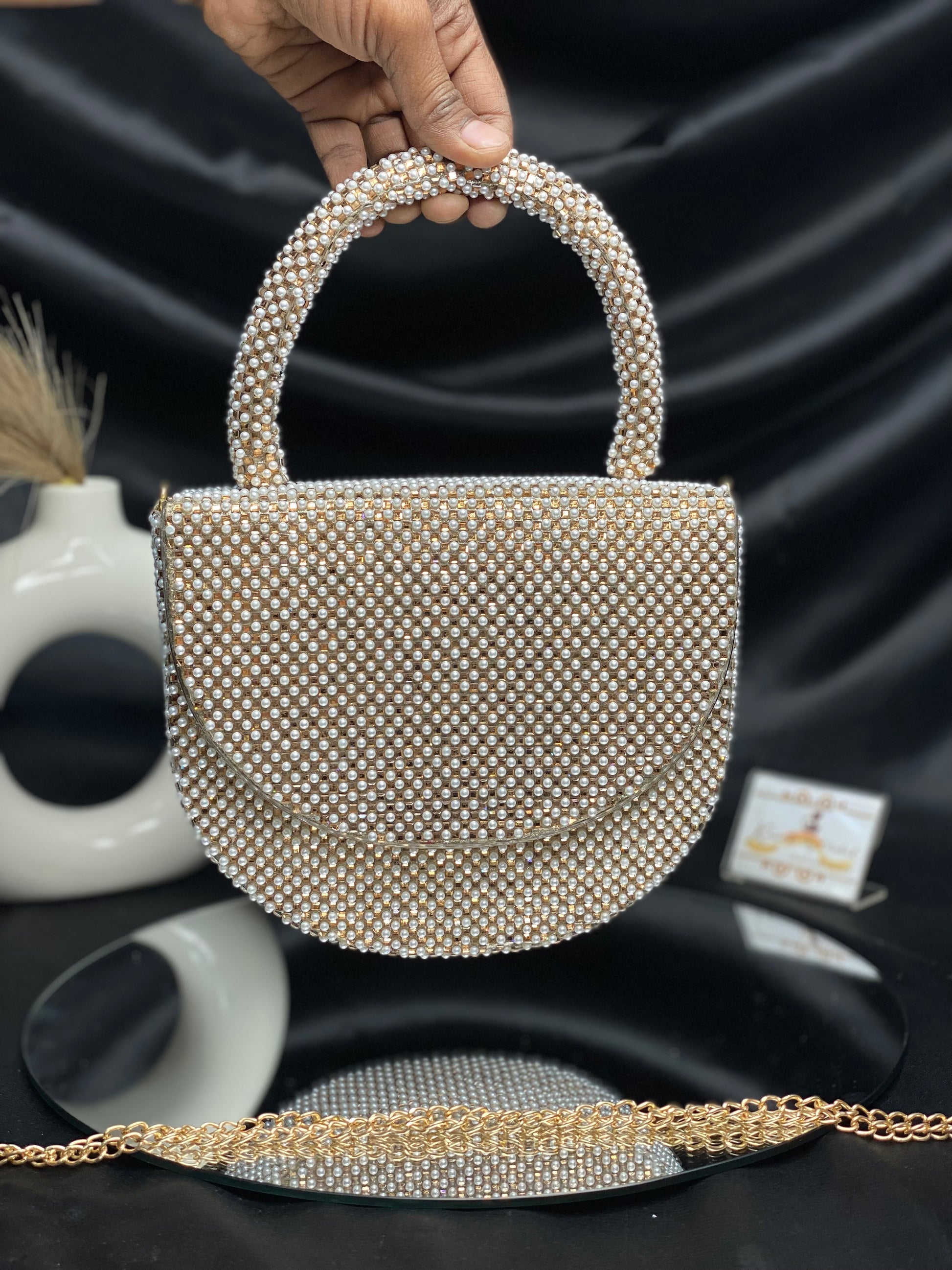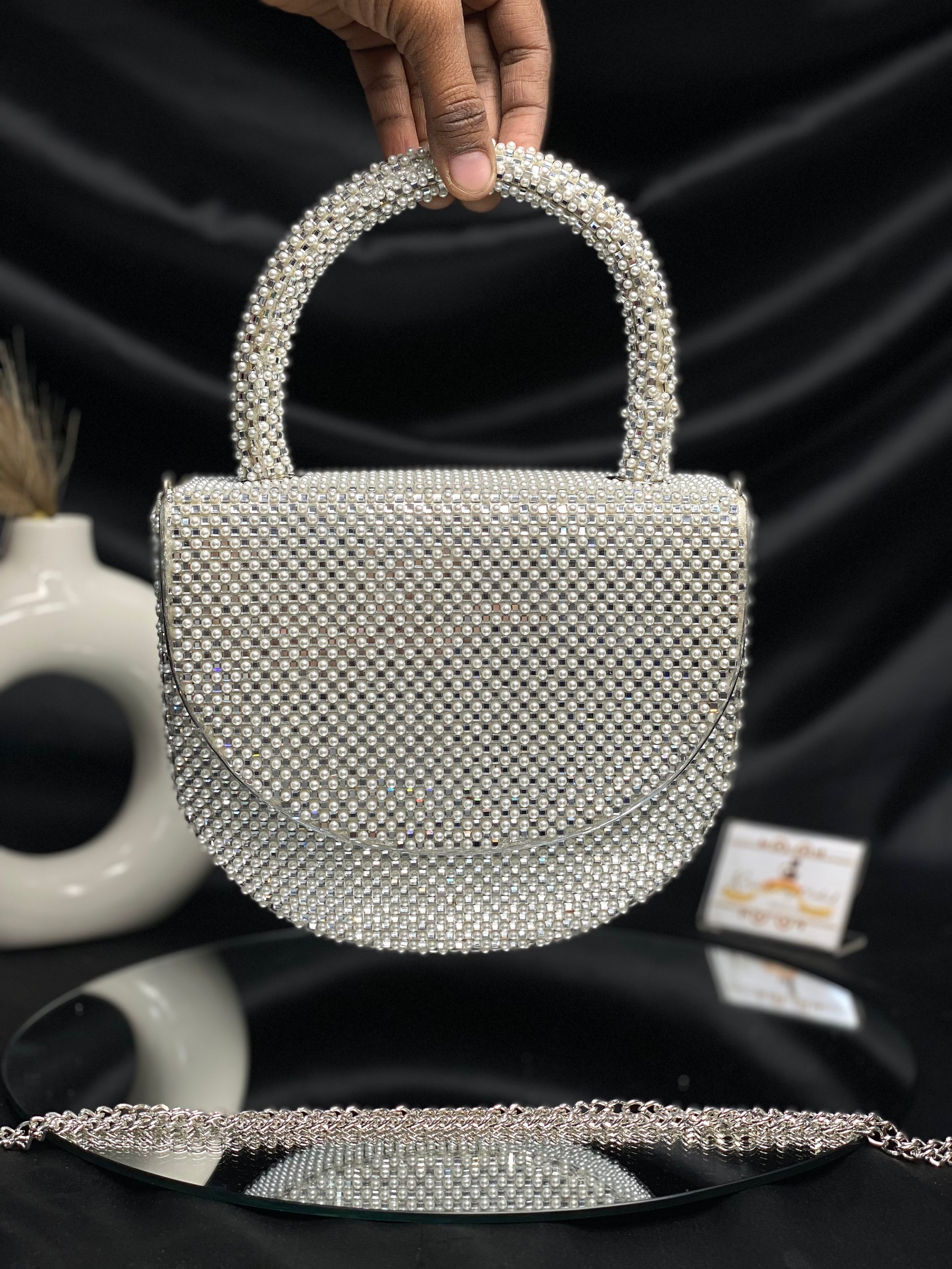 Introducing the latest Bollywood sensation's must-have accessory – a chic designer bag adorned with delicate pearl detailing. This trendy arm candy combines glamour with sophistication, catching every eye with its subtle shimmer. Elevate your style quotient and embrace the allure of Bollywood fashion with this exquisite accessory.