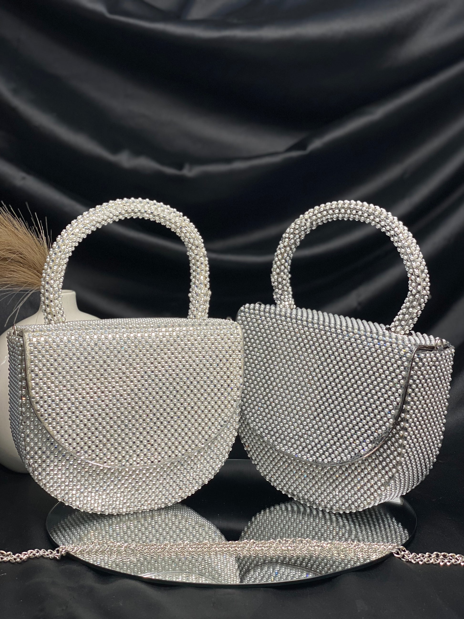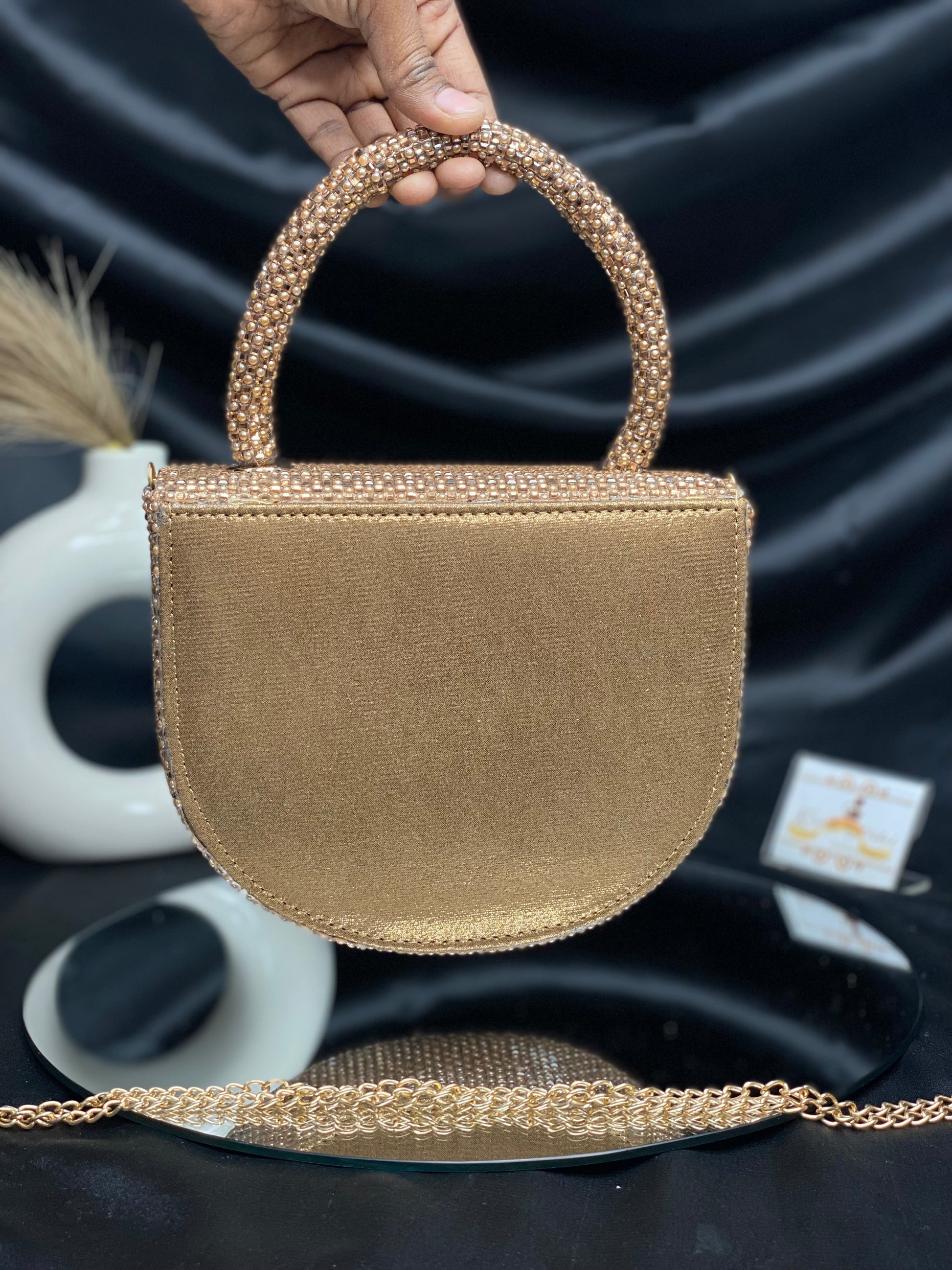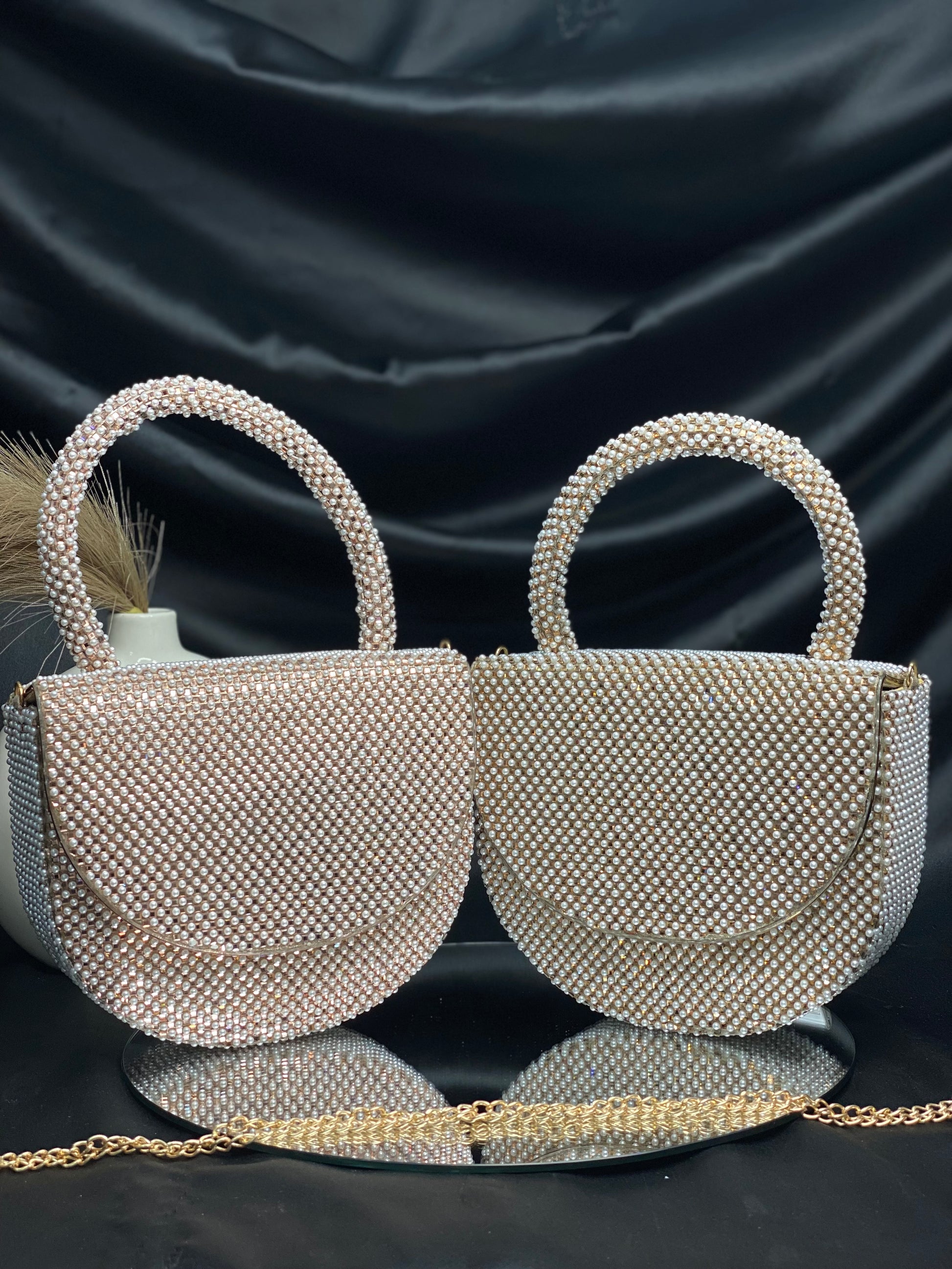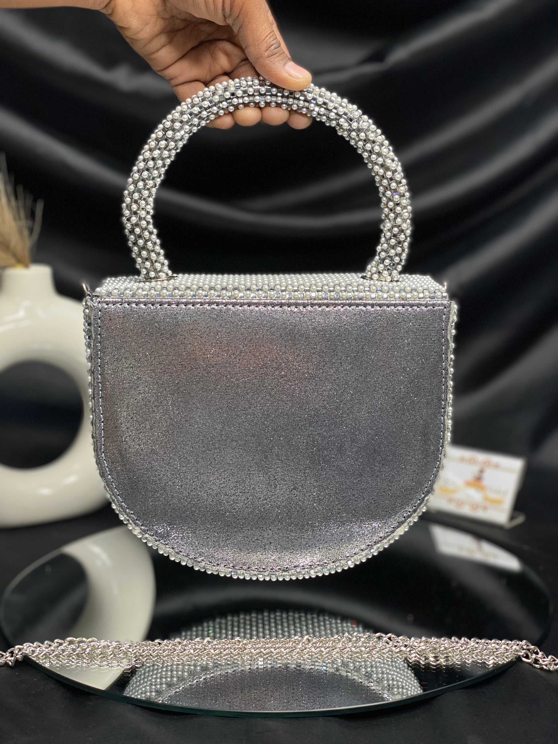 Introducing the latest Bollywood sensation's must-have accessory – a chic designer bag adorned with delicate pearl detailing. This trendy arm candy combines glamour with sophistication, catching every eye with its subtle shimmer. Elevate your style quotient and embrace the allure of Bollywood fashion with this exquisite accessory.