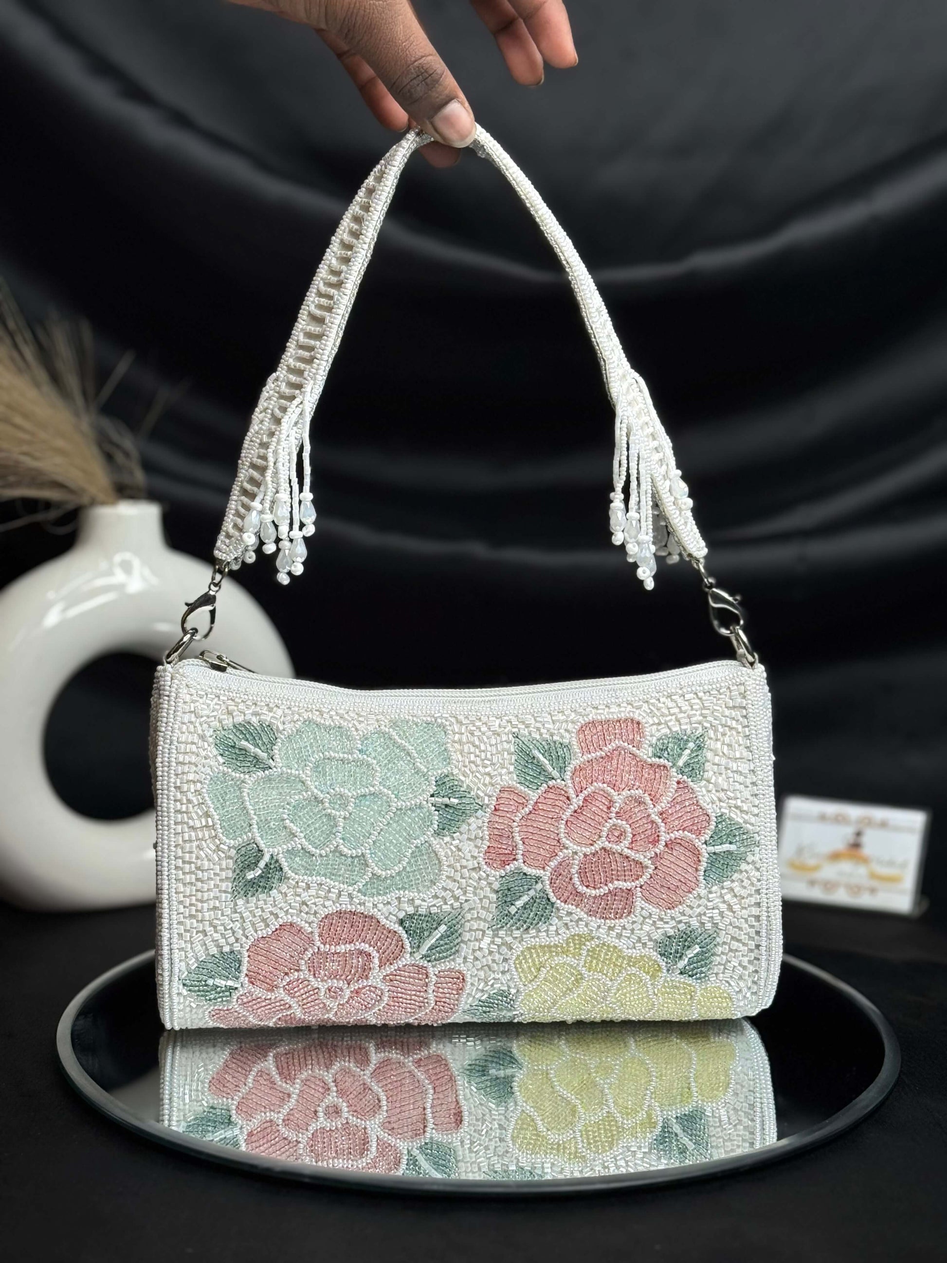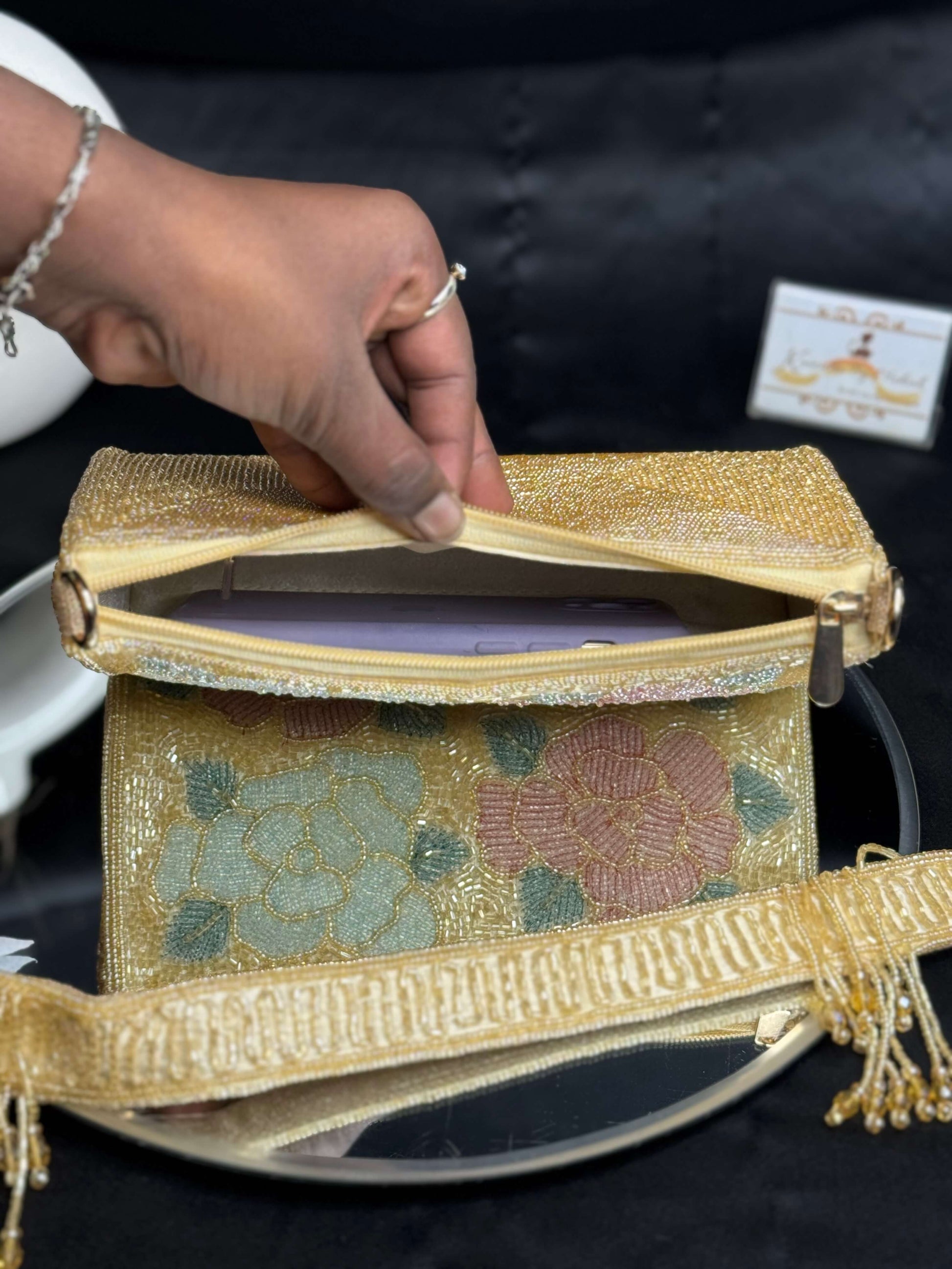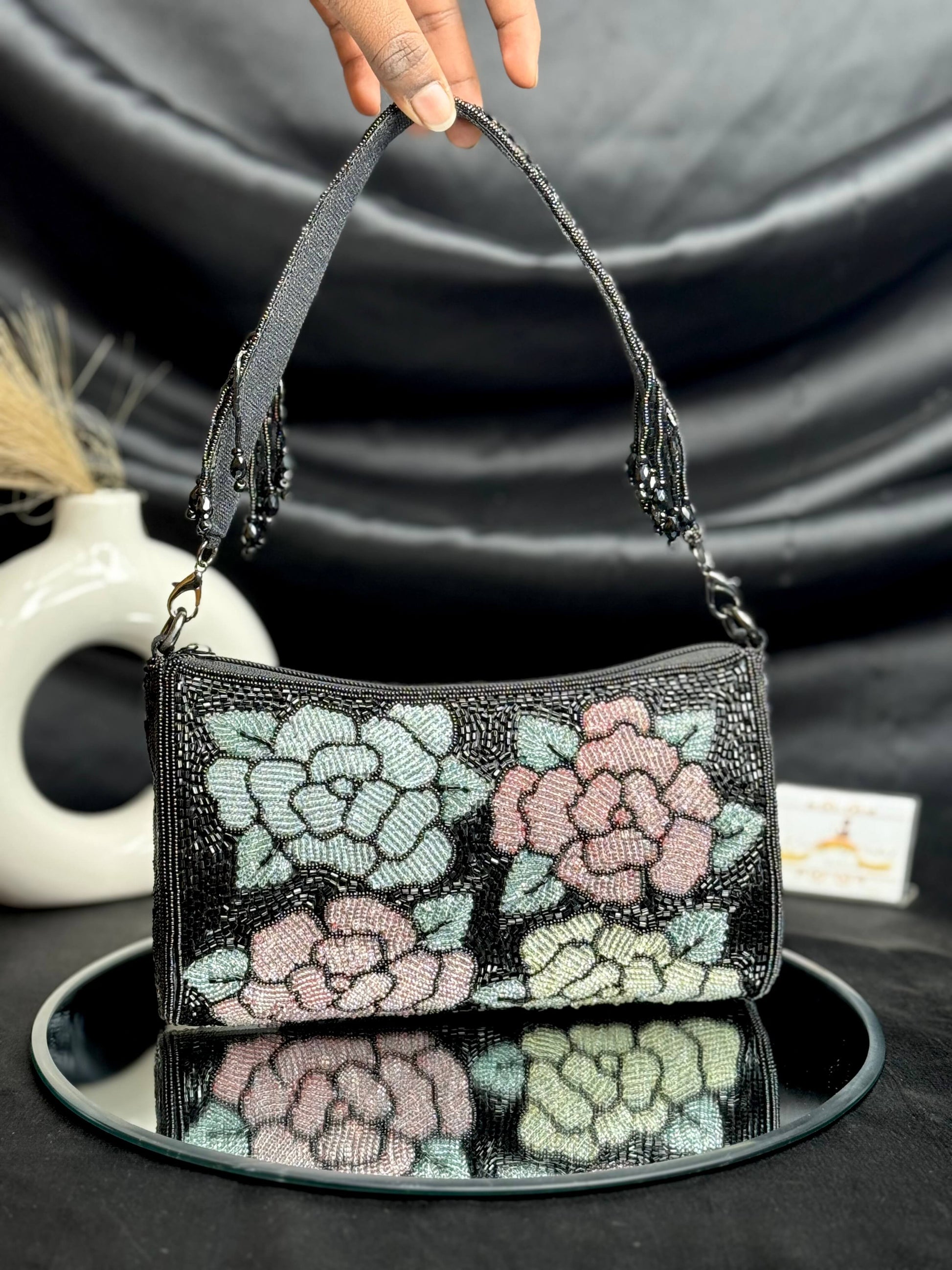 The Caroline Zip Bag combines style and functionality with its flower sequins embellishments, cutdana accents, and spacious zippered compartment. Perfect for keeping your essentials organized and easily accessible.