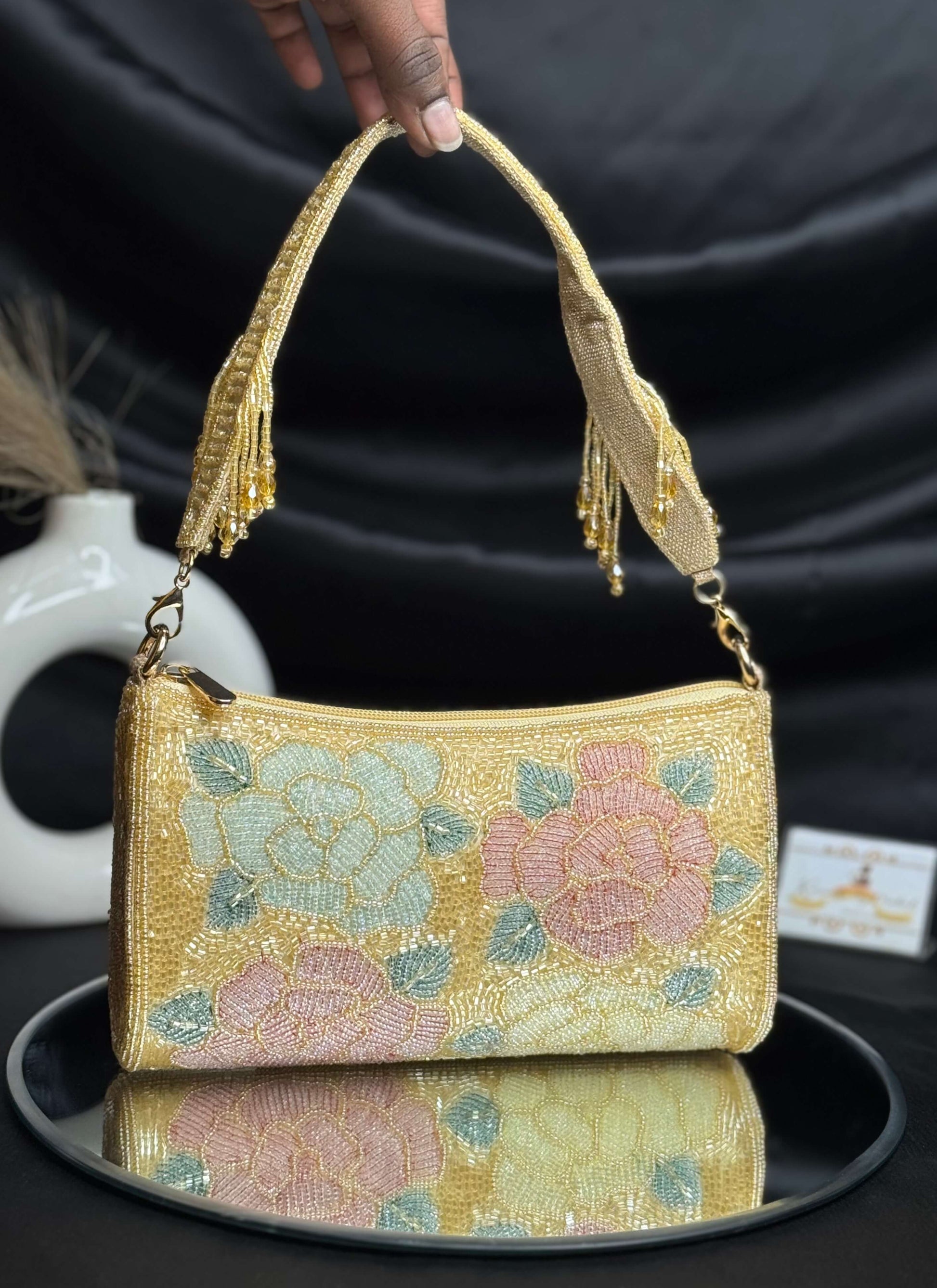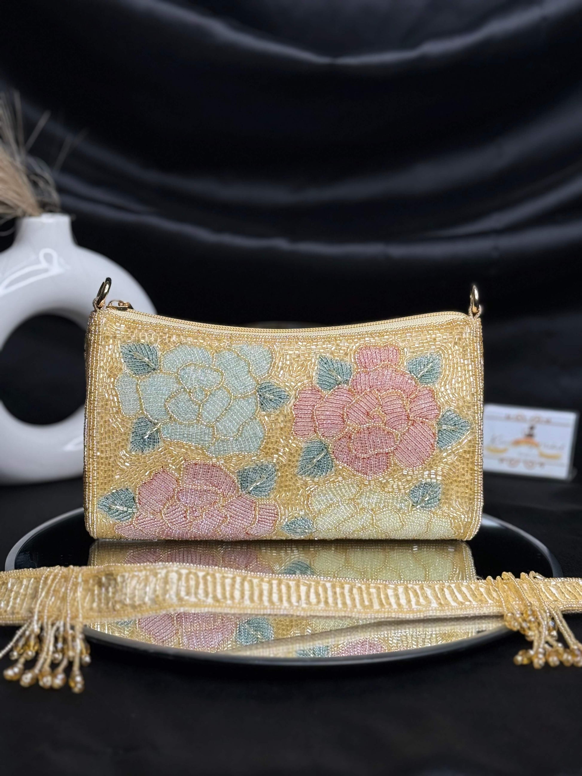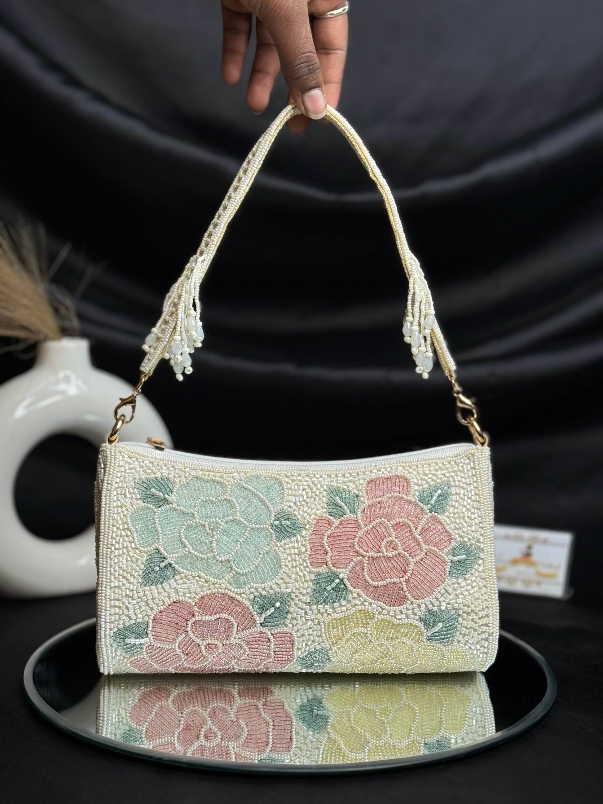 The Caroline Zip Bag combines style and functionality with its flower sequins embellishments, cutdana accents, and spacious zippered compartment. Perfect for keeping your essentials organized and easily accessible.