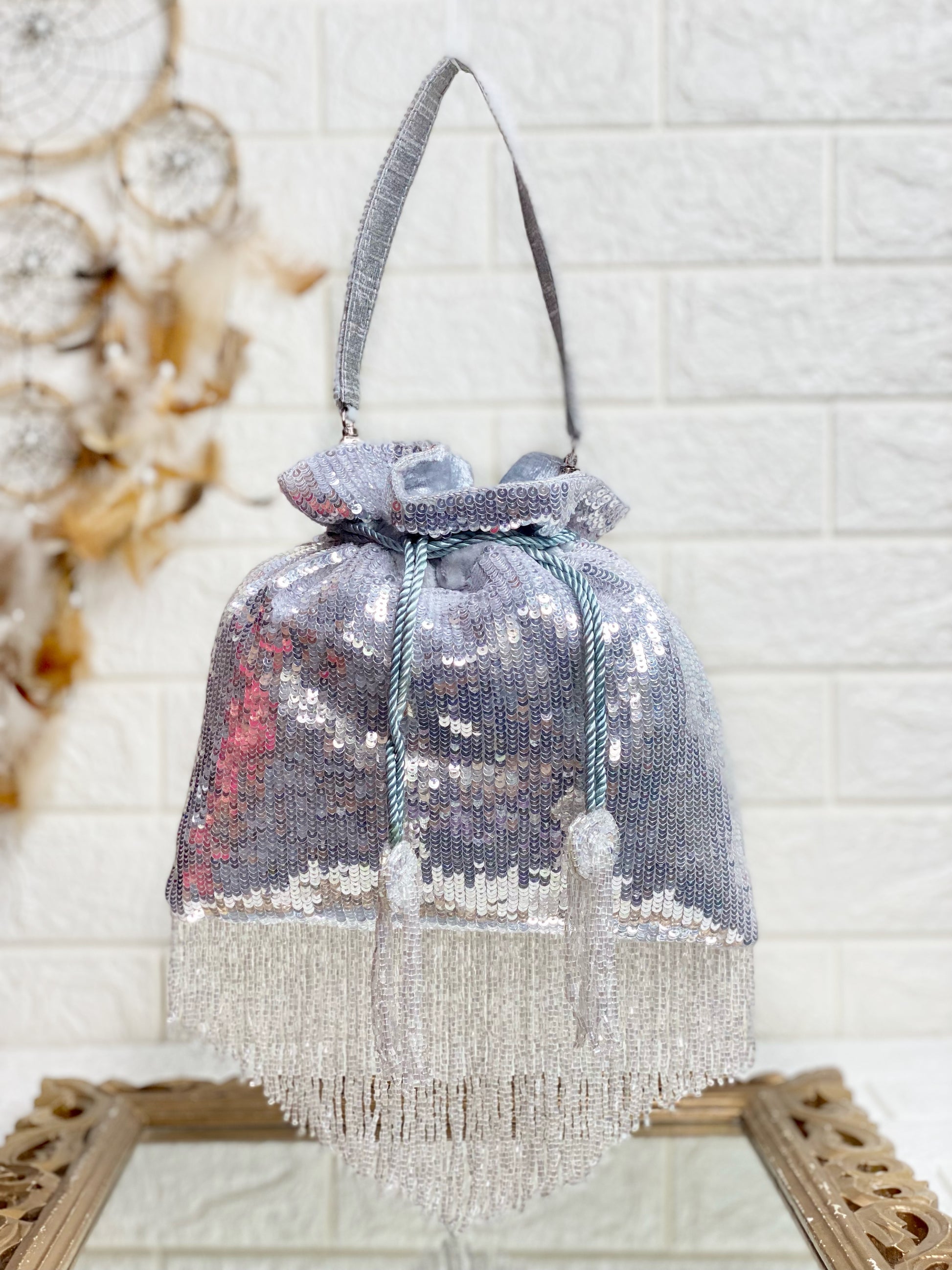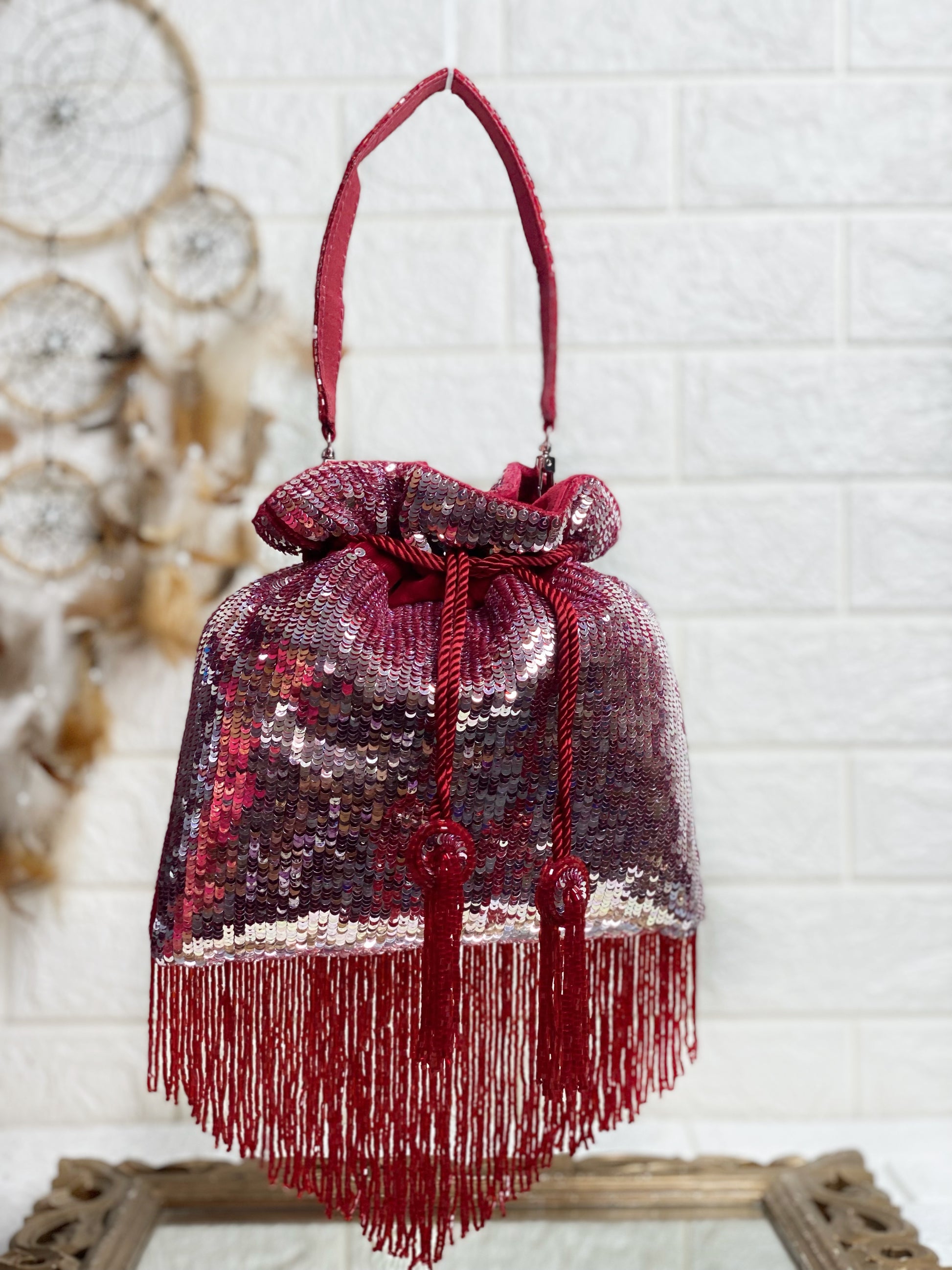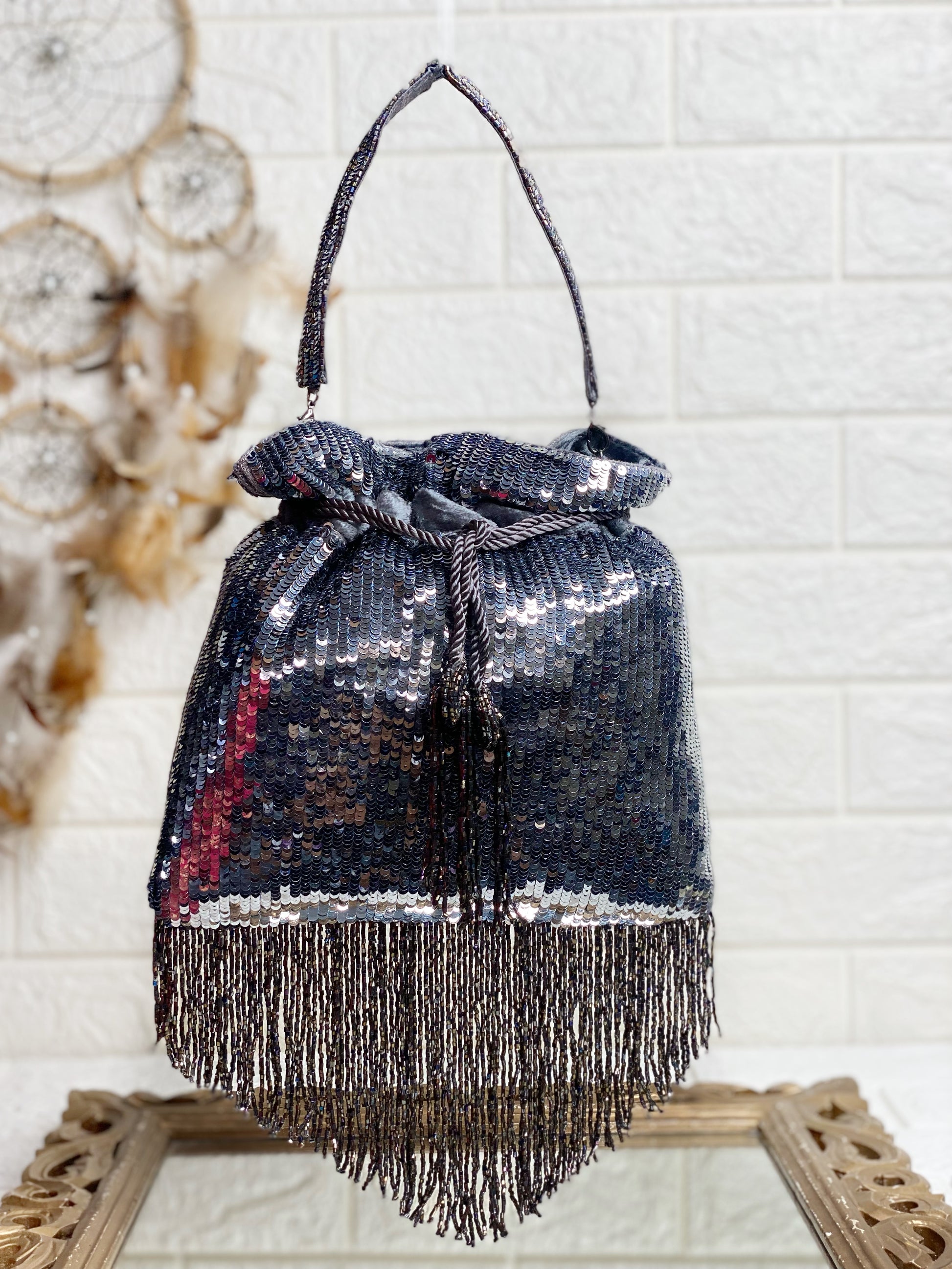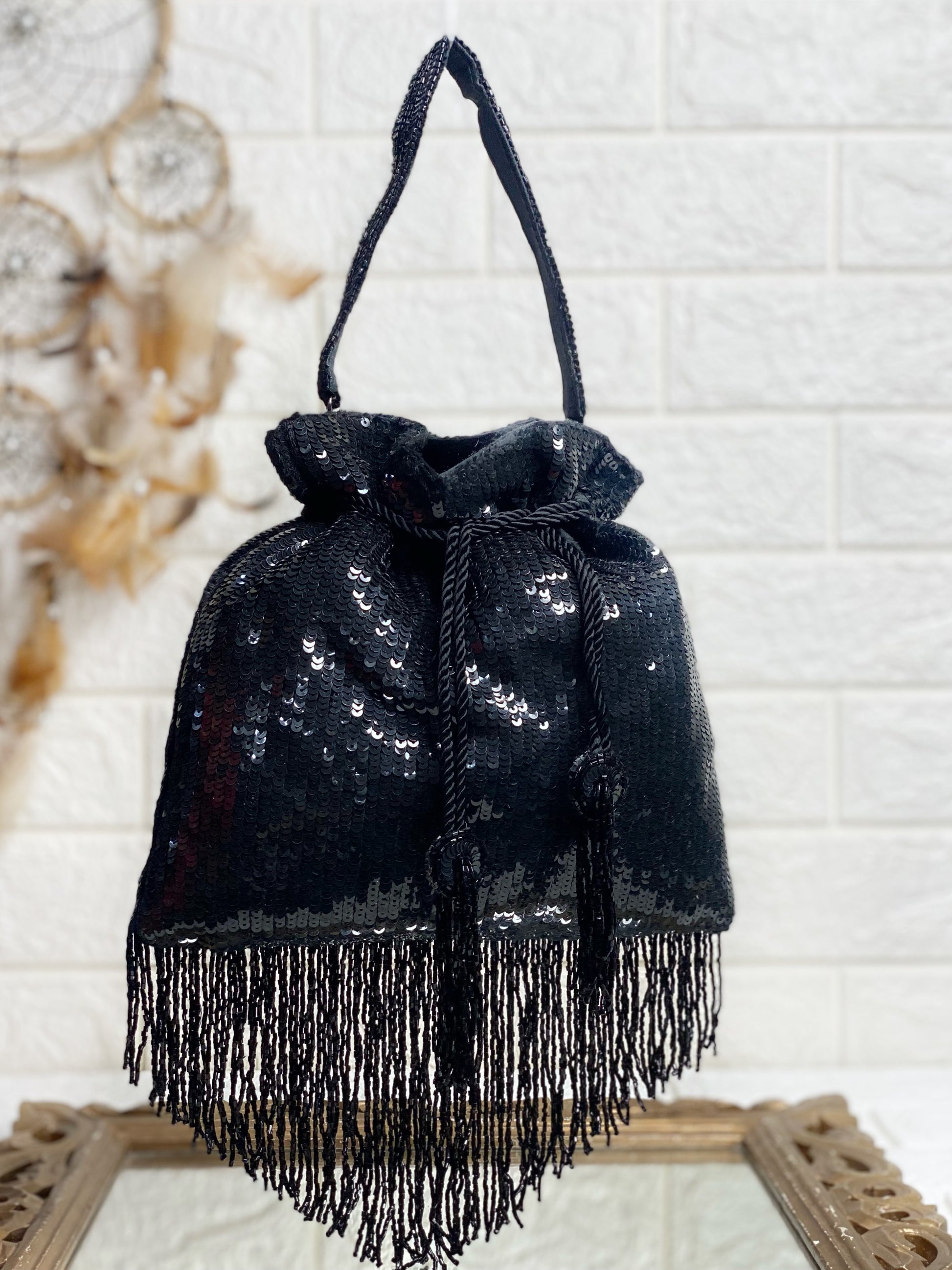 Upgrade your accessory game with Kahani Potli. This luxurious bag features intricate sequins work, crafted from soft velvet material and finished with playful fringes. Elevate any outfit with a touch of elegance and sophistication.