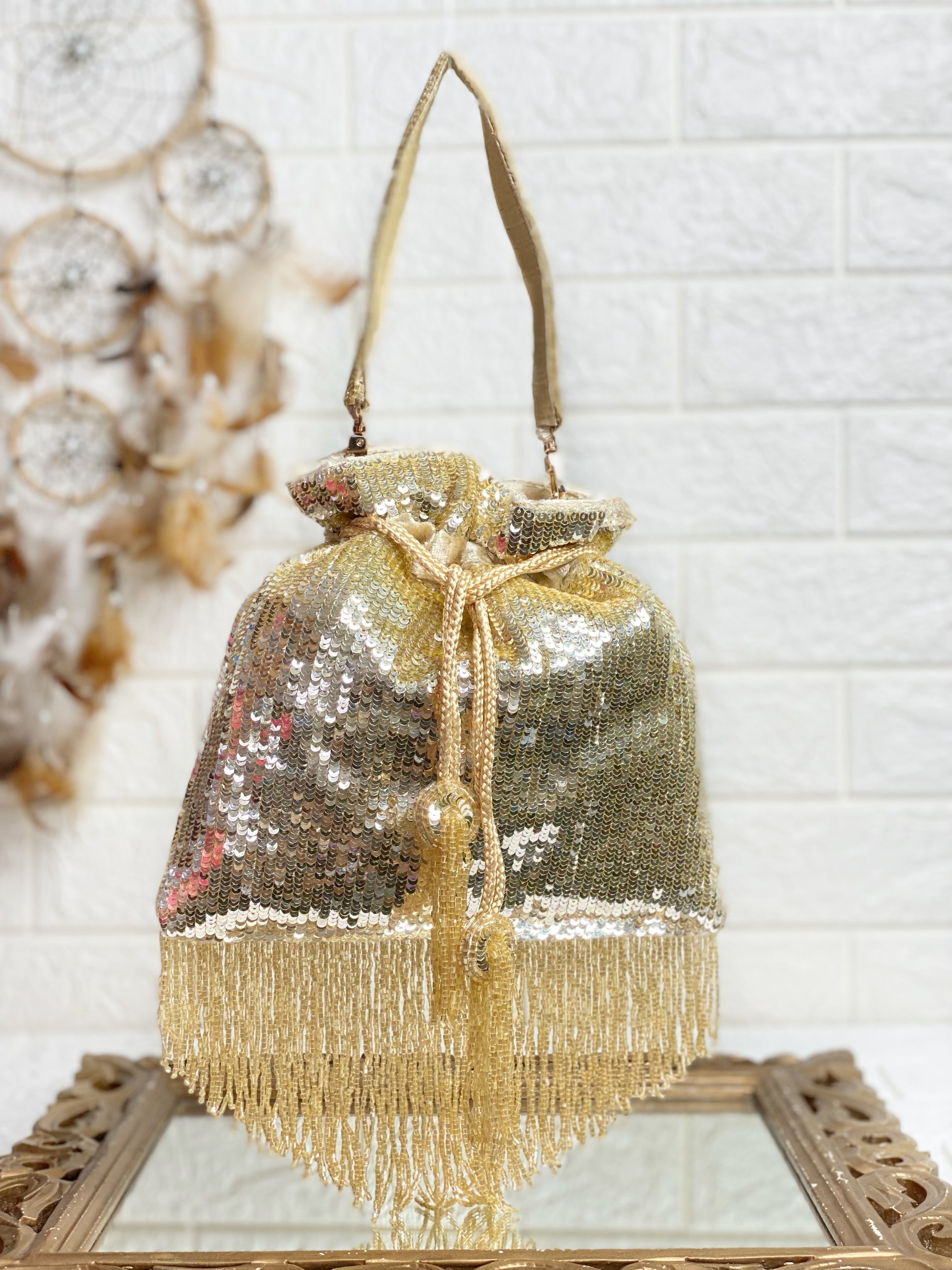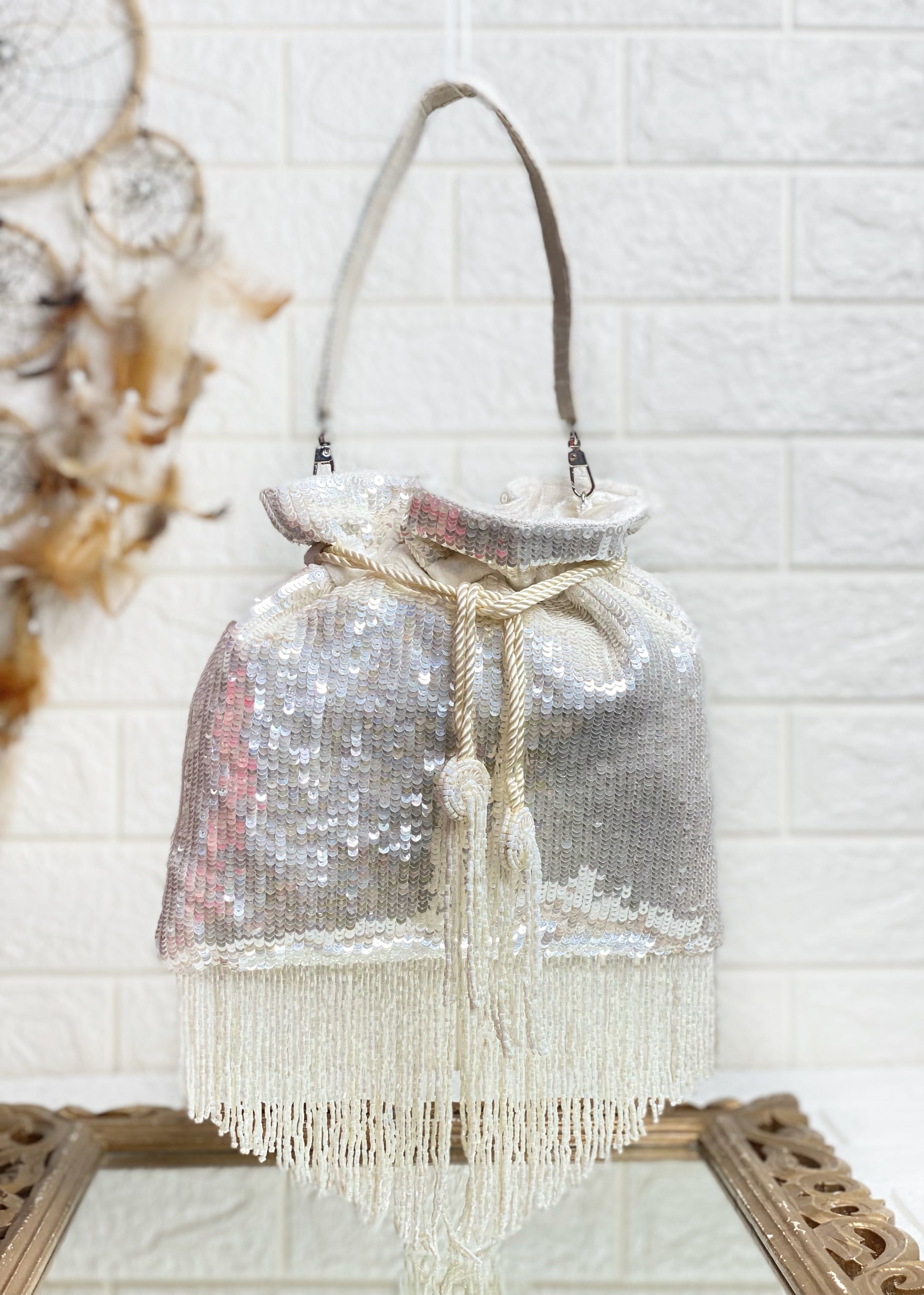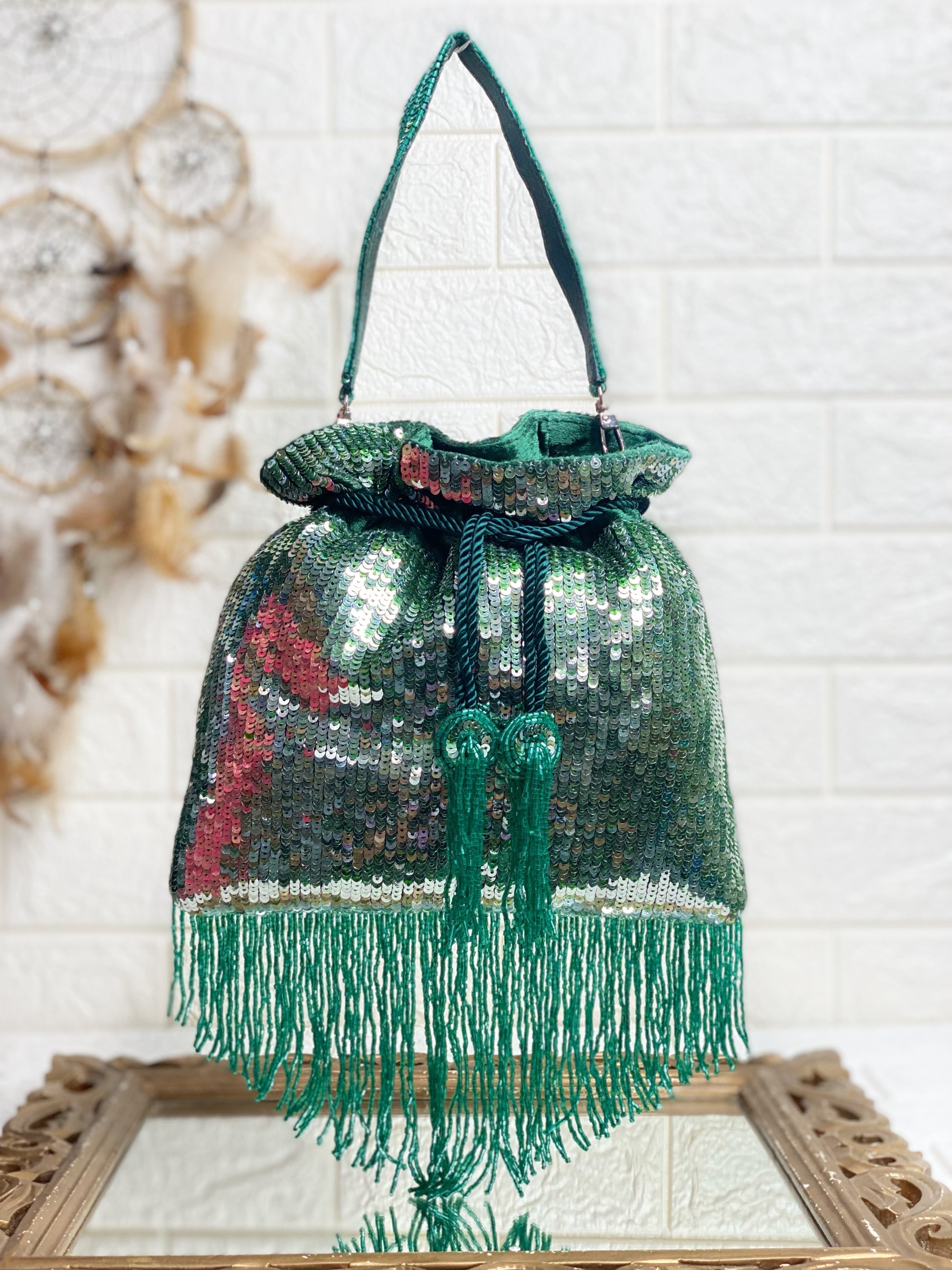 Upgrade your accessory game with Kahani Potli. This luxurious bag features intricate sequins work, crafted from soft velvet material and finished with playful fringes. Elevate any outfit with a touch of elegance and sophistication.