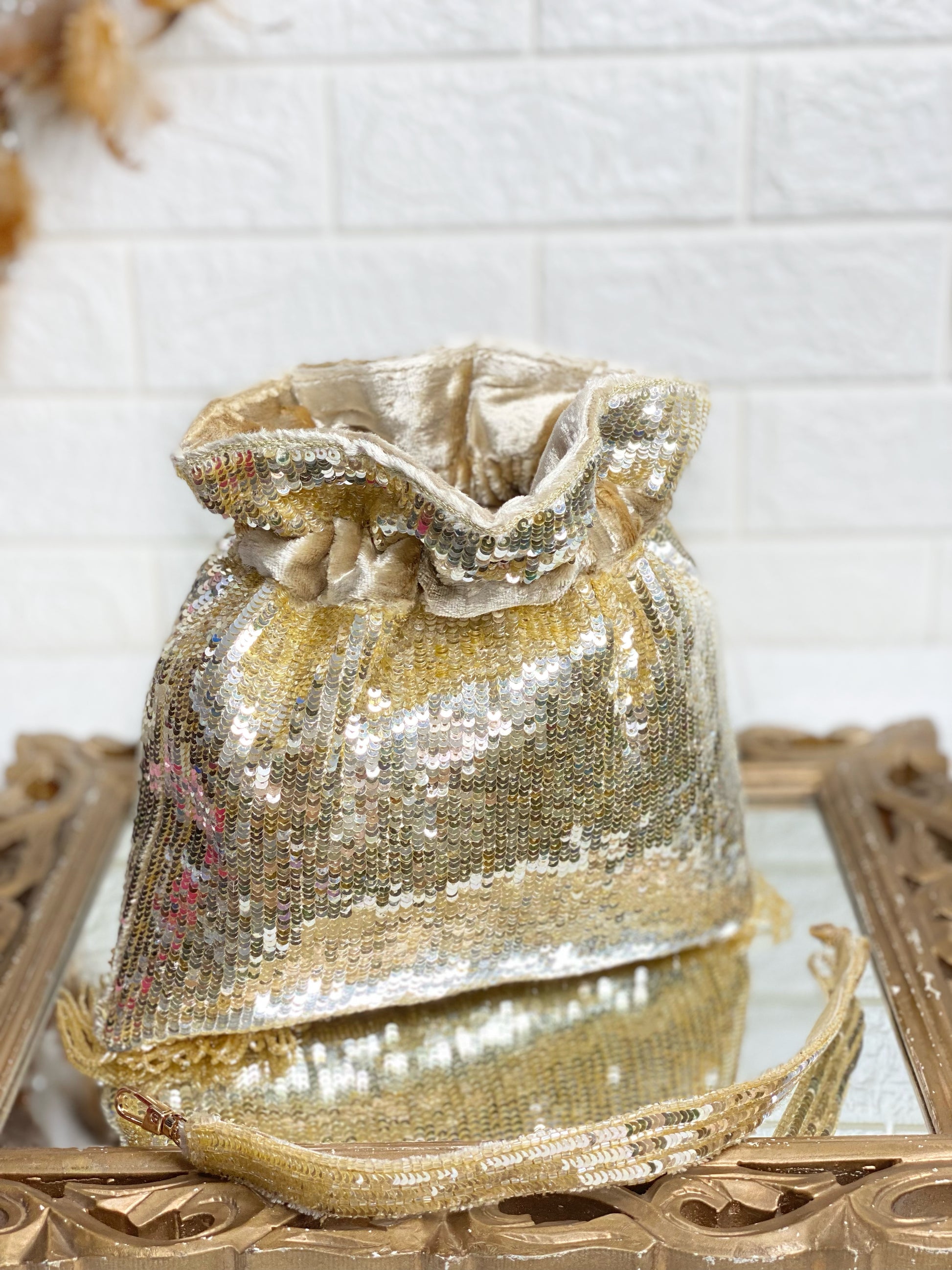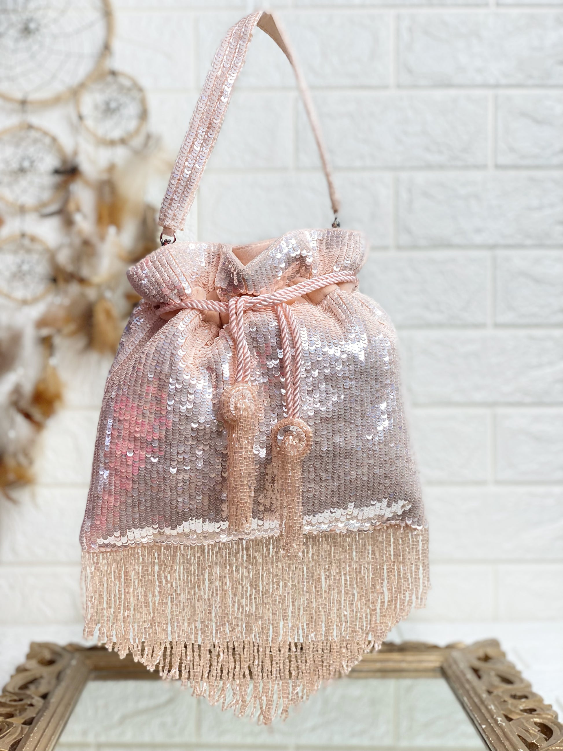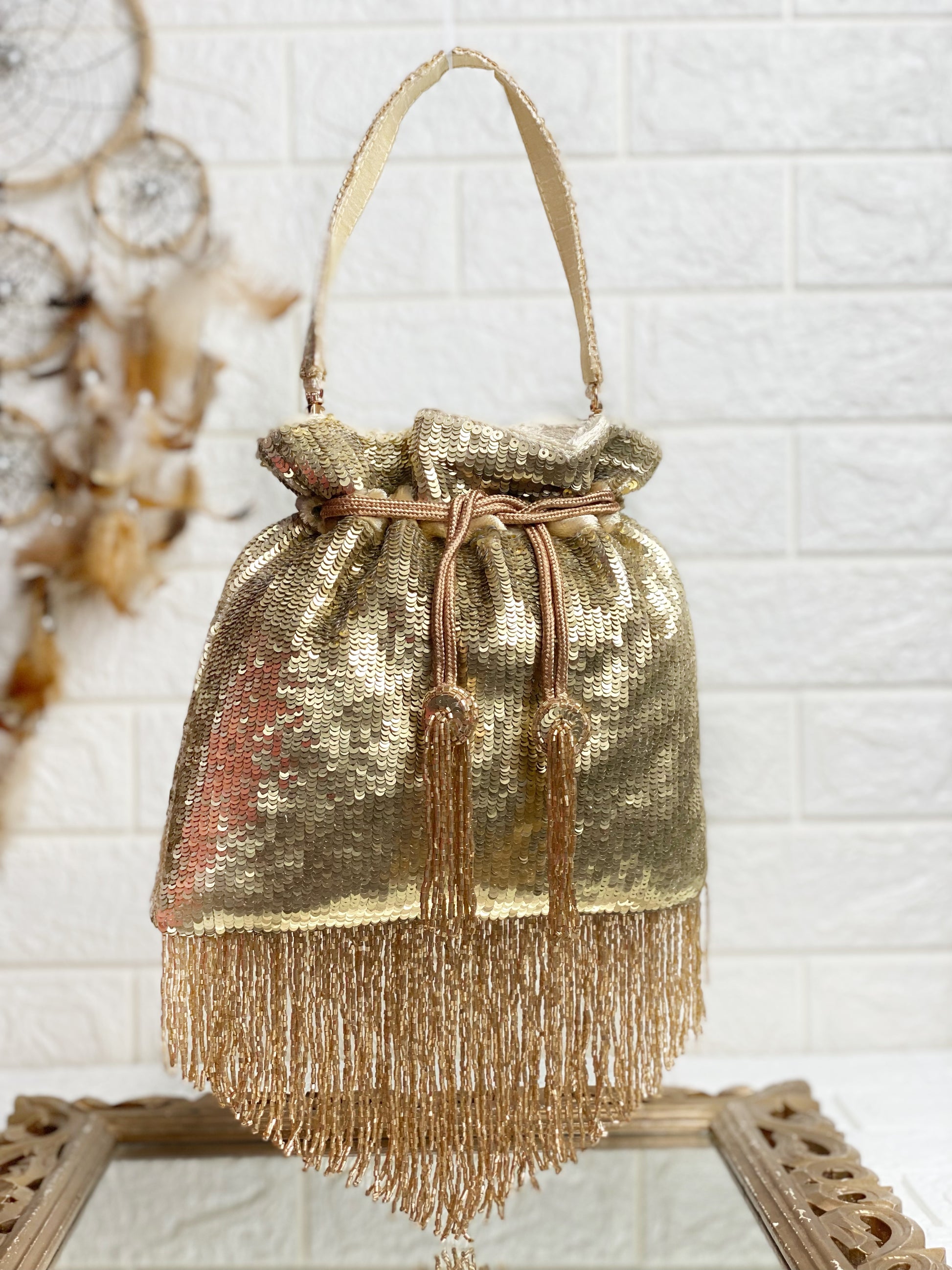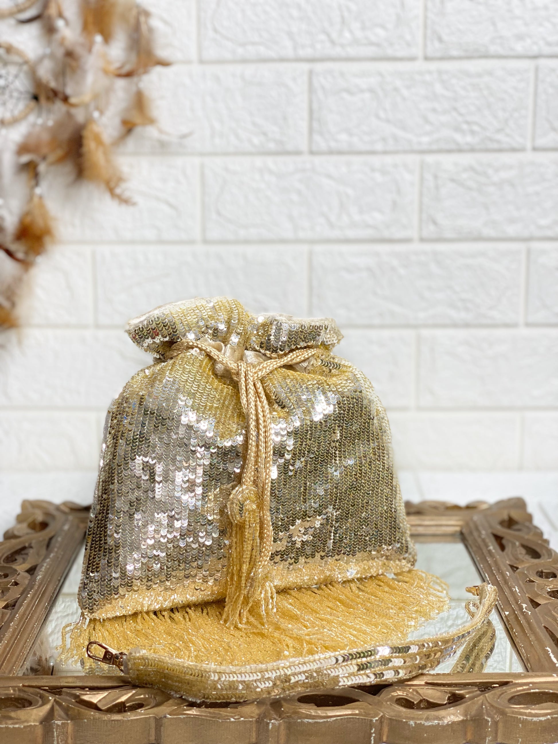 Upgrade your accessory game with Kahani Potli. This luxurious bag features intricate sequins work, crafted from soft velvet material and finished with playful fringes. Elevate any outfit with a touch of elegance and sophistication.