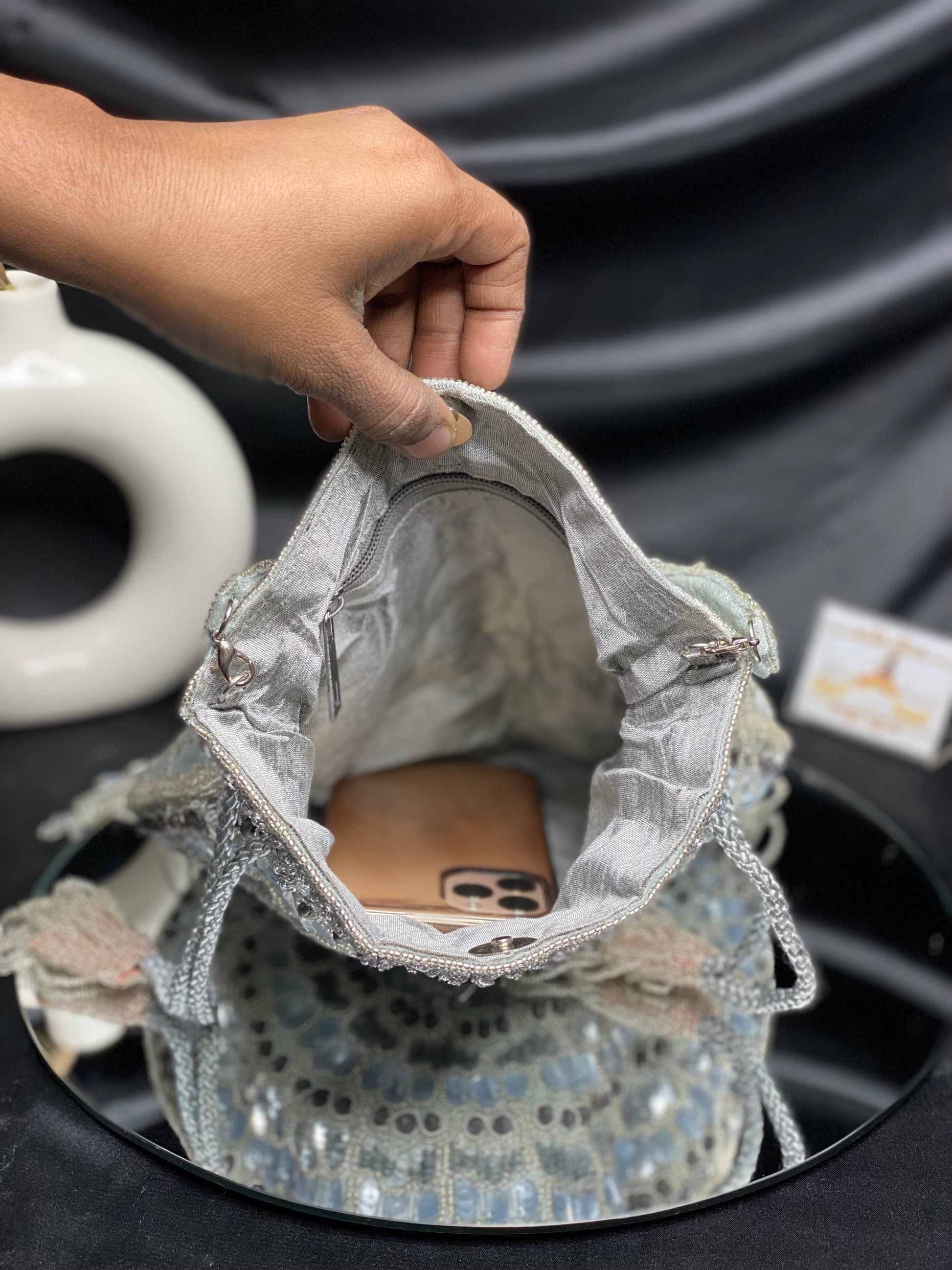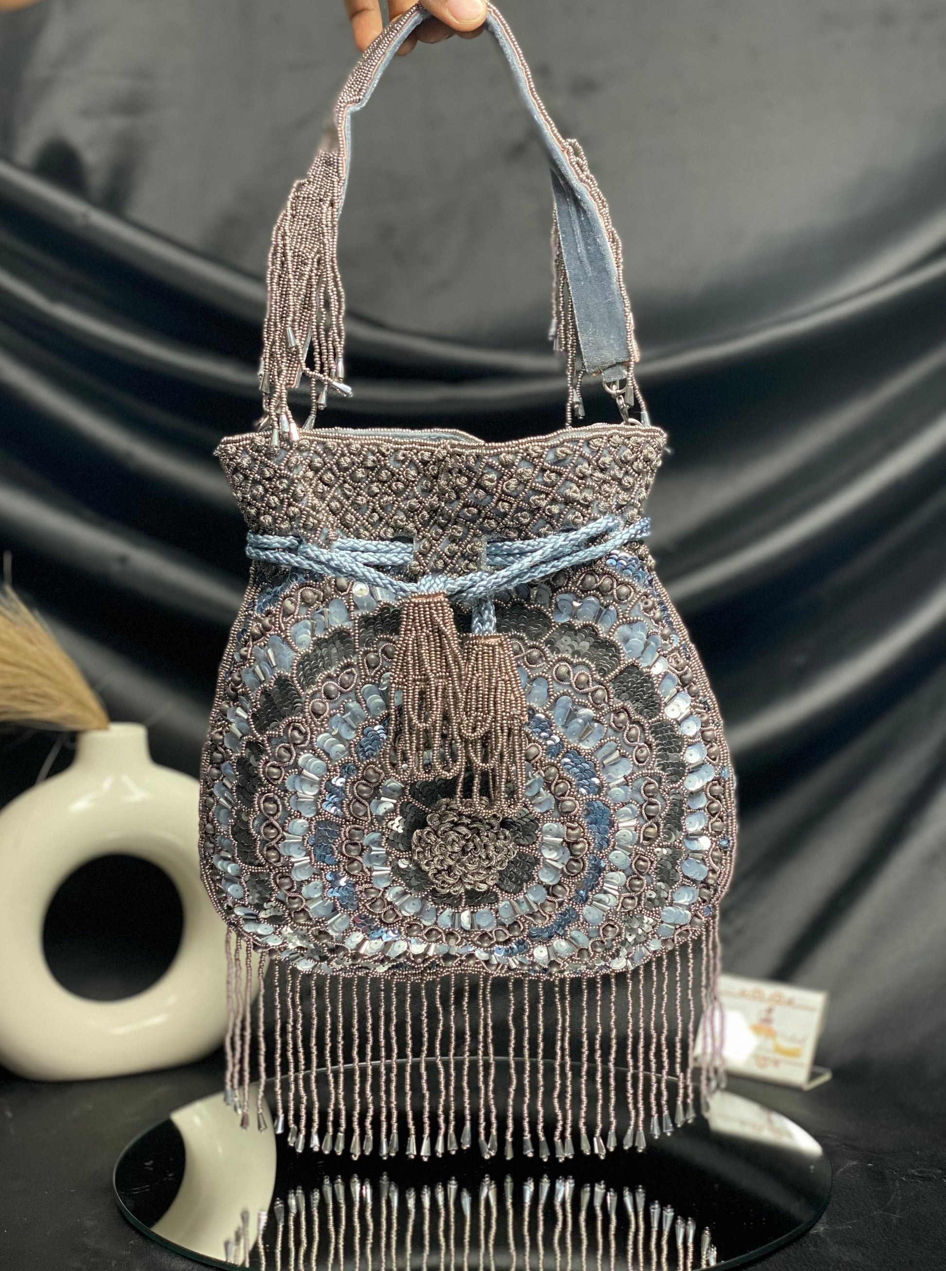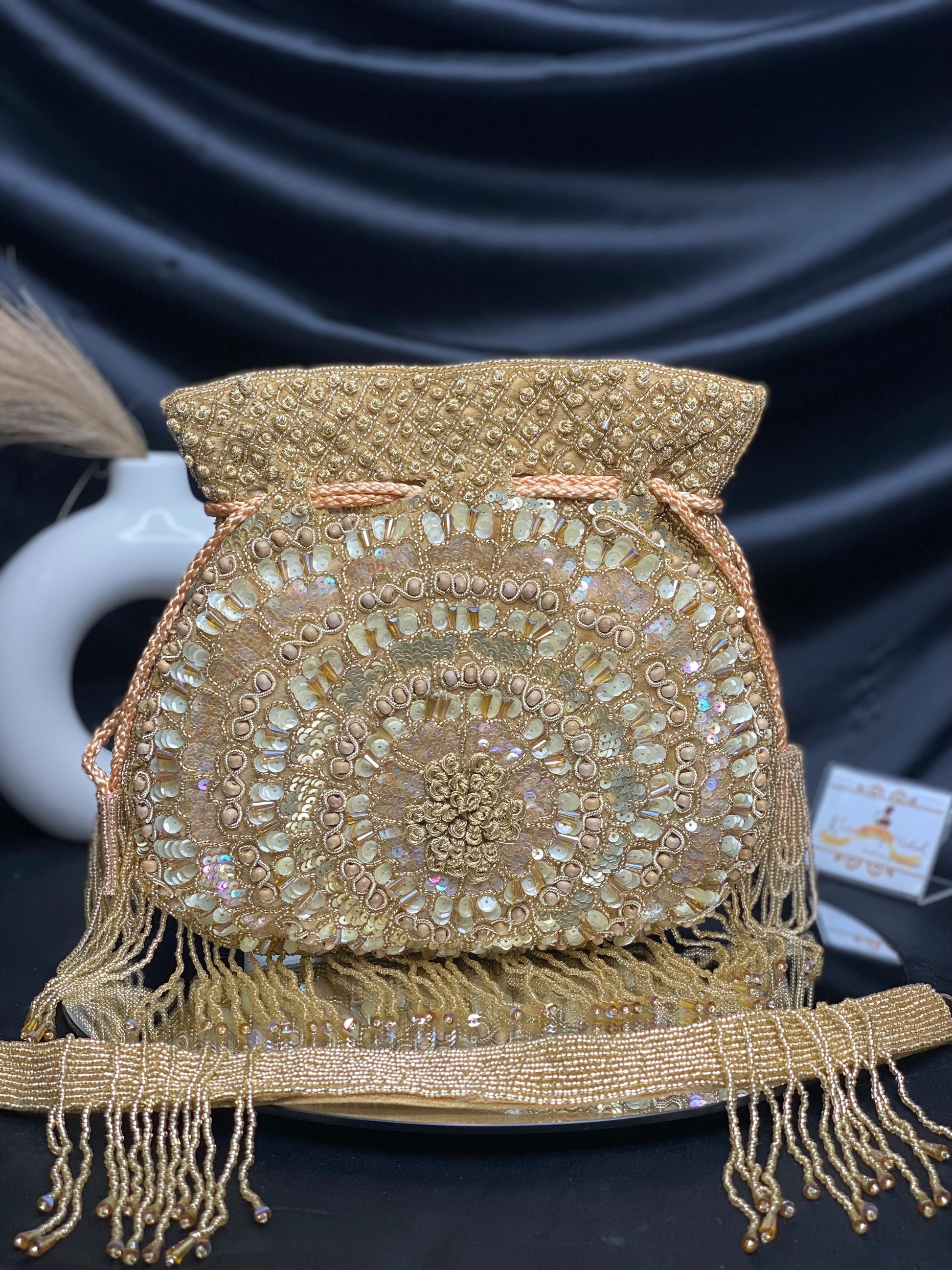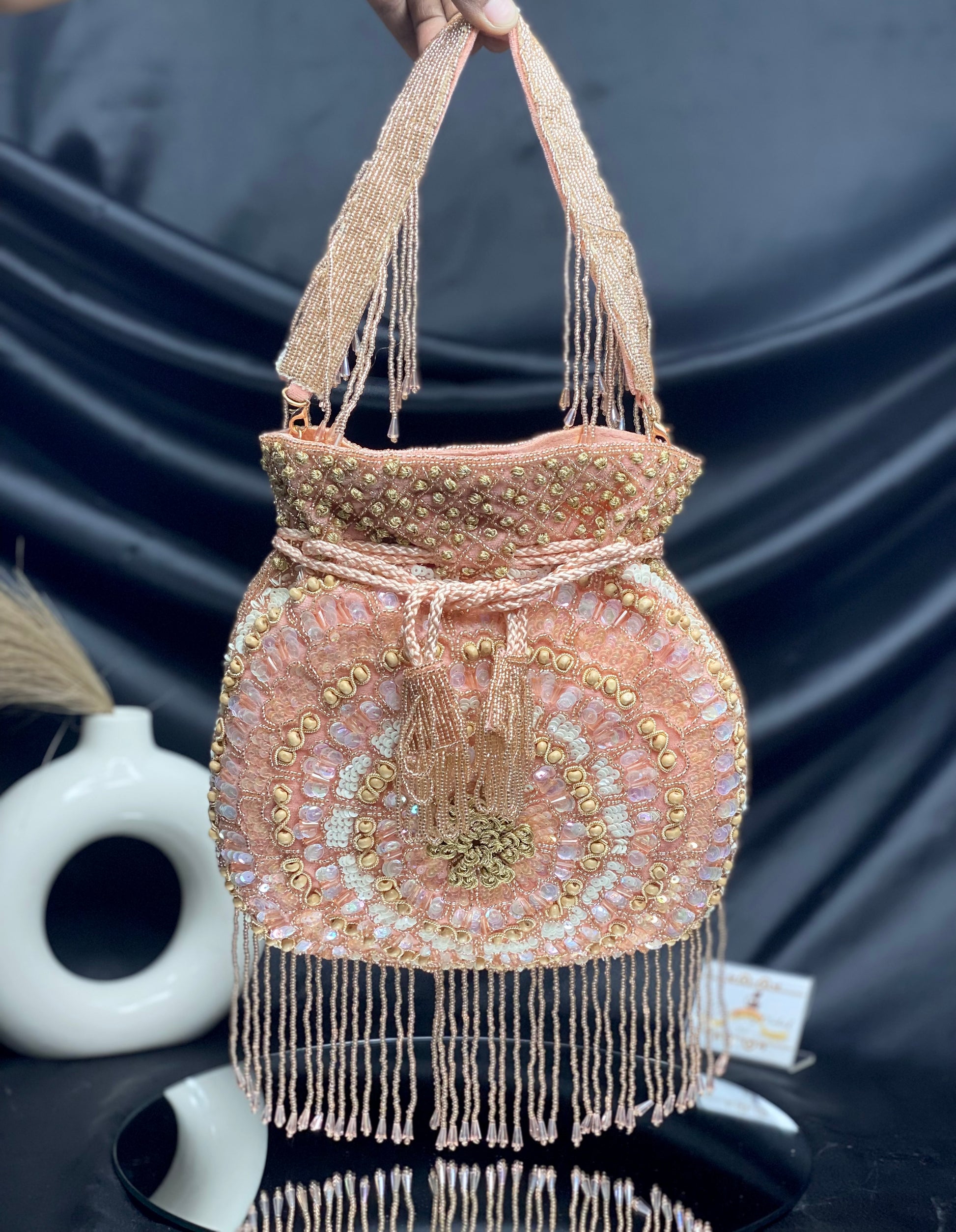 The potli bag adorned with intricate stone and katt dana work exudes timeless elegance, combining traditional craftsmanship with contemporary style. Its meticulous detailing makes it a charming accessory, blending cultural richness with modern fashion.