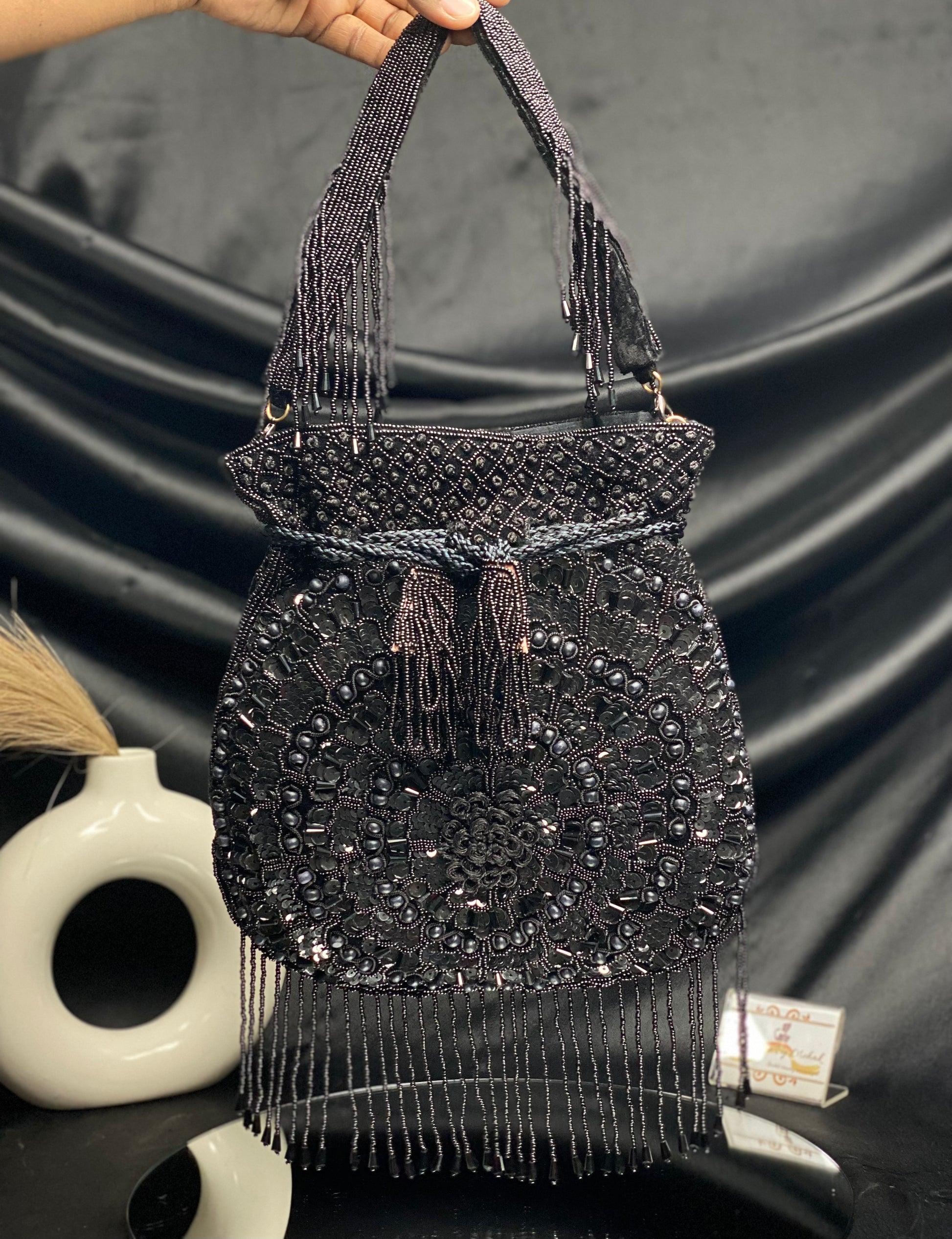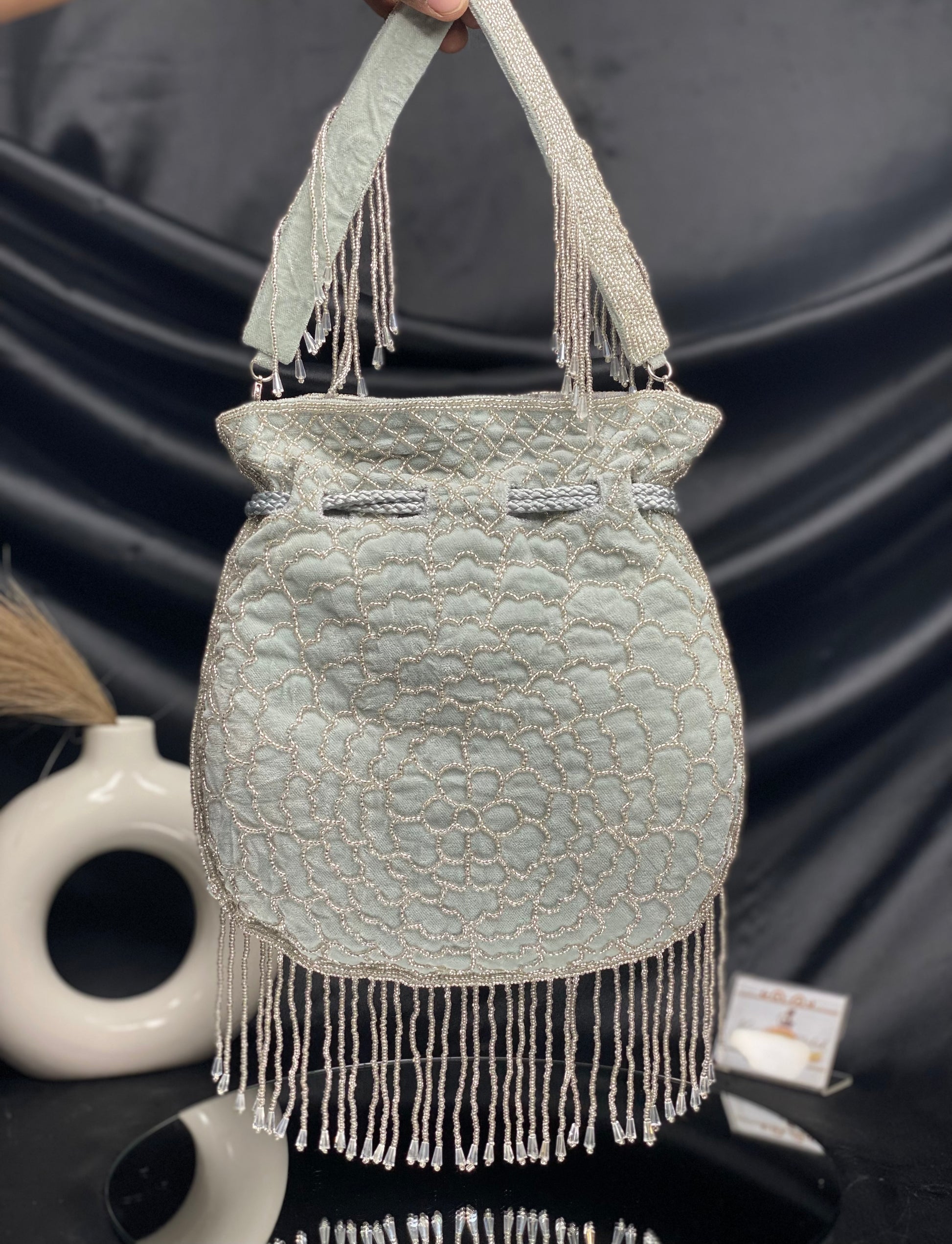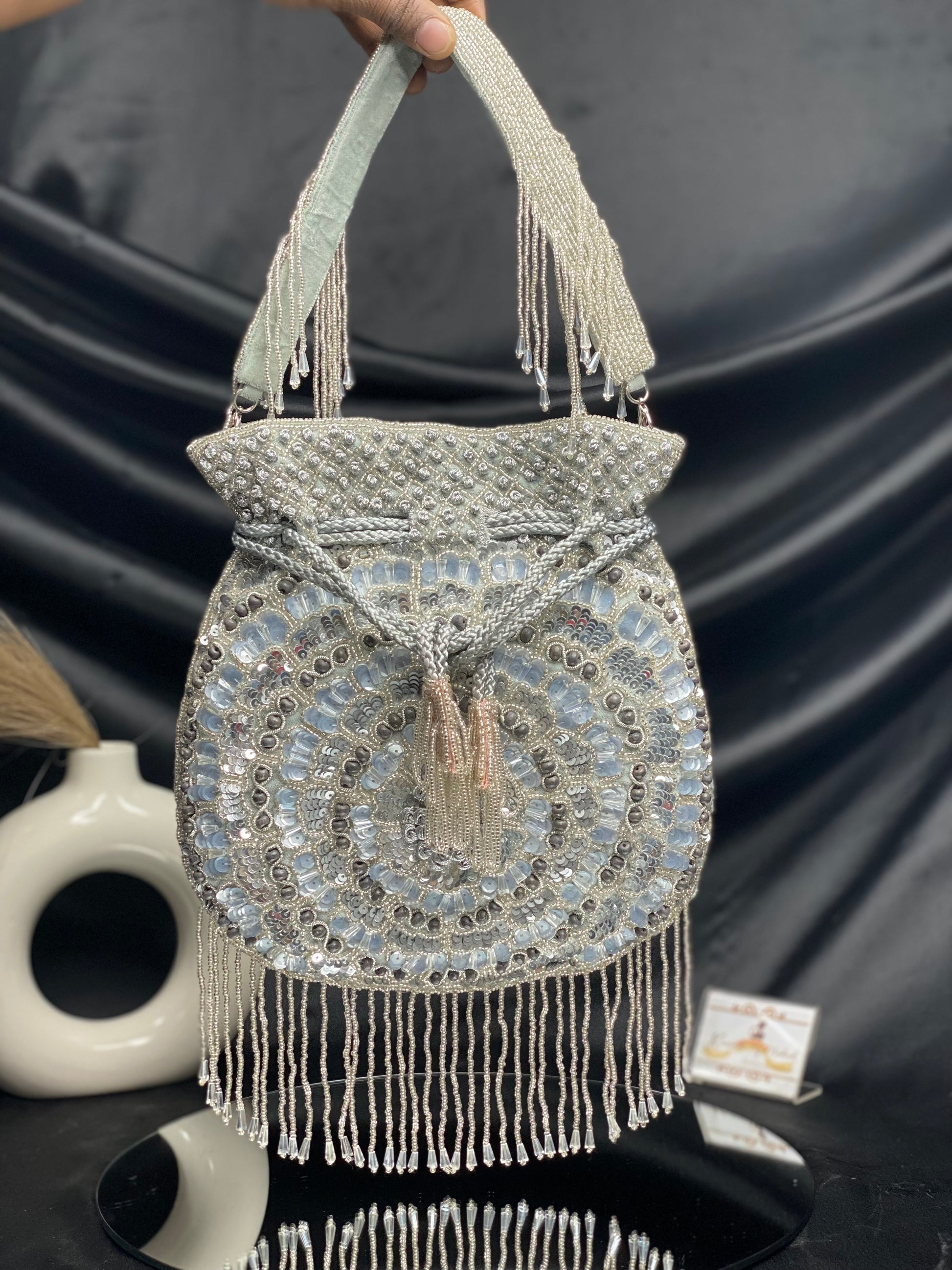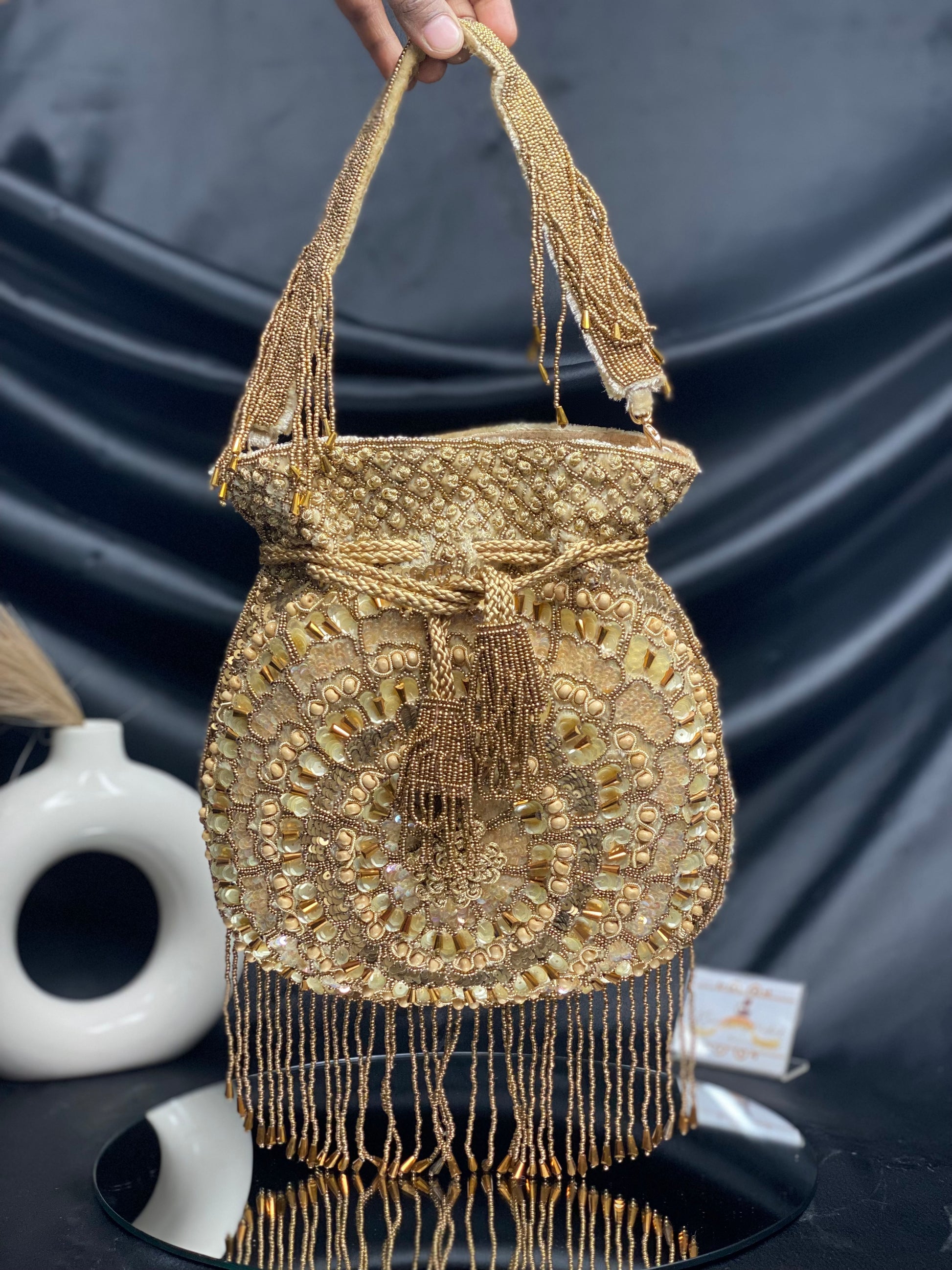 The potli bag adorned with intricate stone and katt dana work exudes timeless elegance, combining traditional craftsmanship with contemporary style. Its meticulous detailing makes it a charming accessory, blending cultural richness with modern fashion.