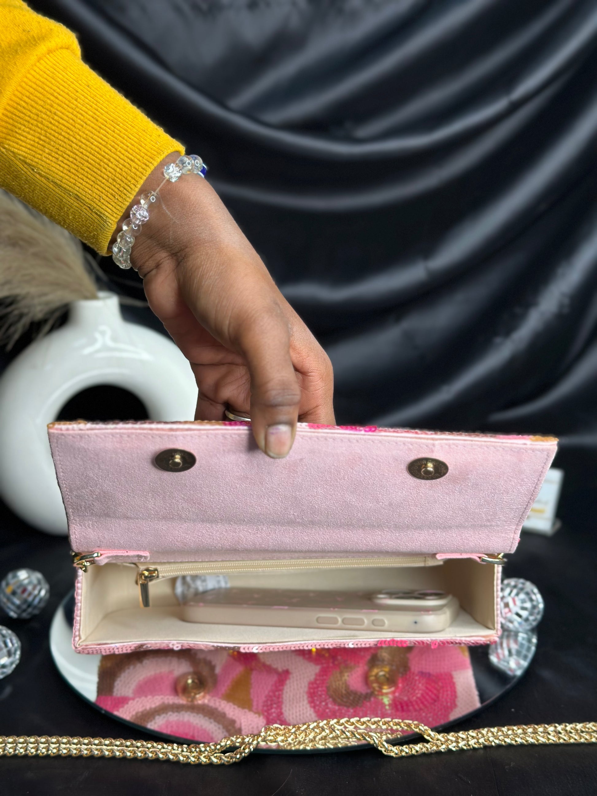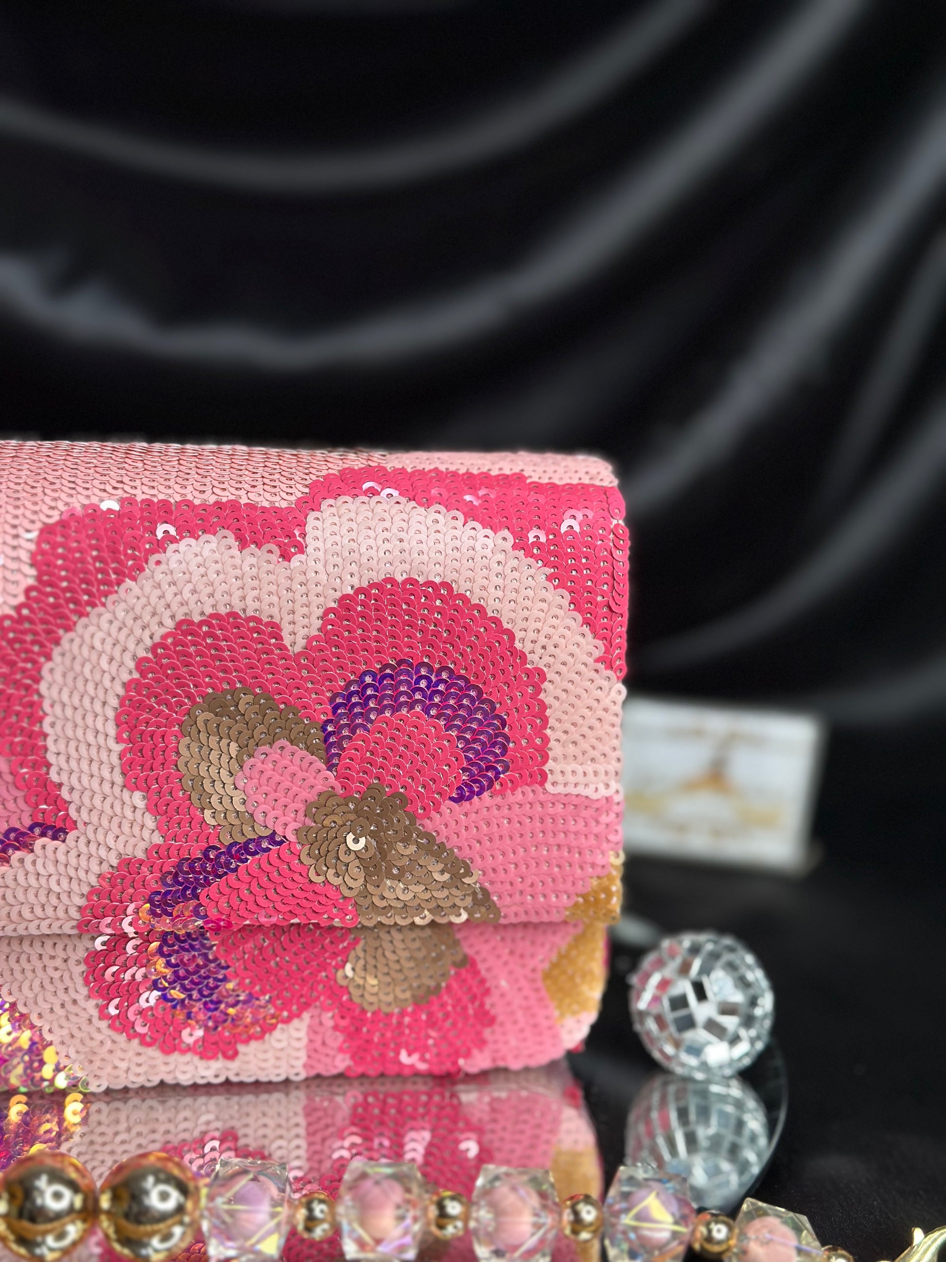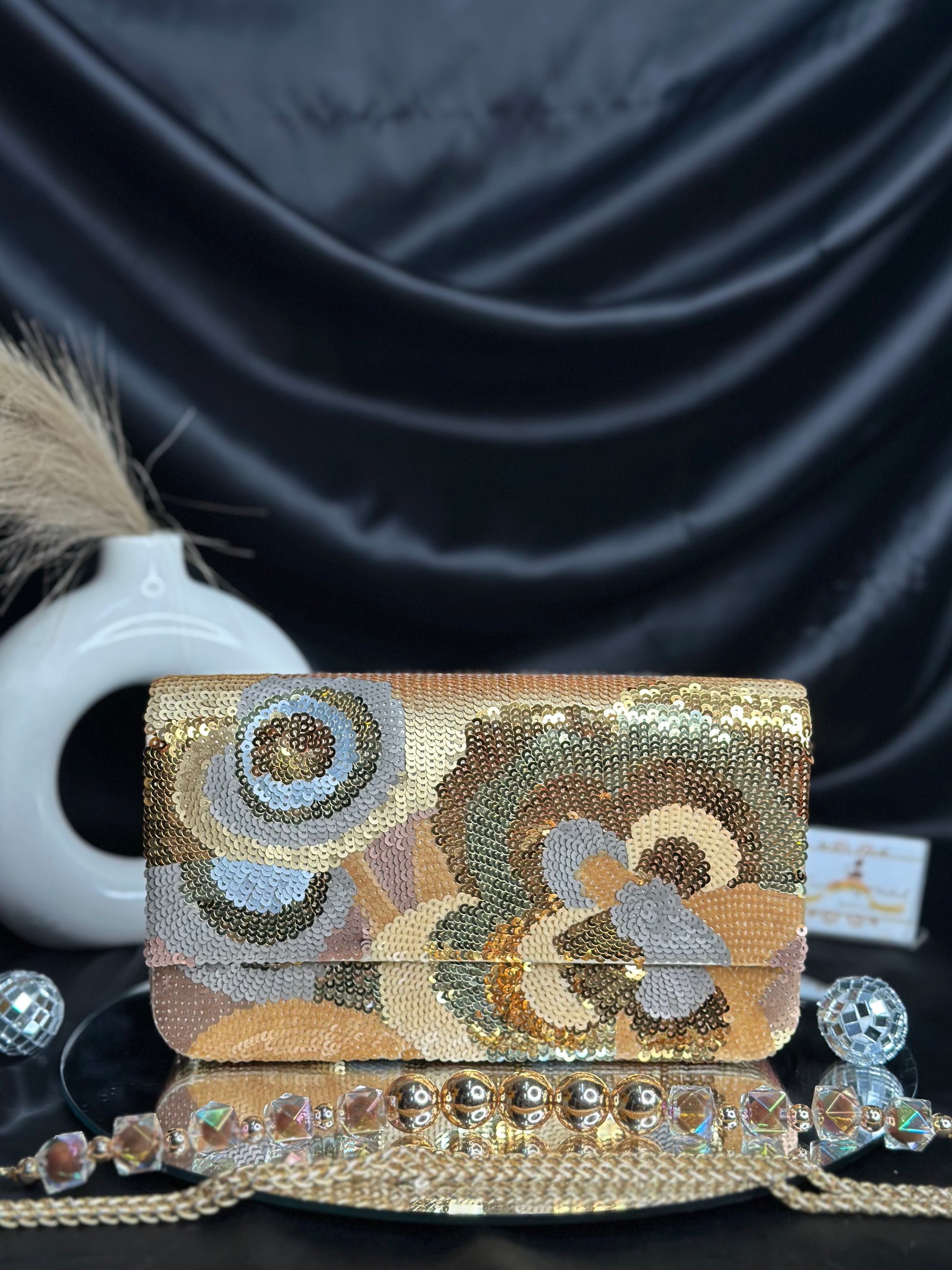 The Dylan Flap Bag combines timeless elegance with contemporary flair. Adorned with intricate sequin detailing and a graceful floral design, this premium accessory elevates any ensemble. The structured flap silhouette offers both sophistication and practicality, while the embellished surface catches light beautifully. Perfect for special occasions or adding a touch of refined glamour to everyday wear, this bag is crafted for those who appreciate quality craftsmanship and distinctive style.