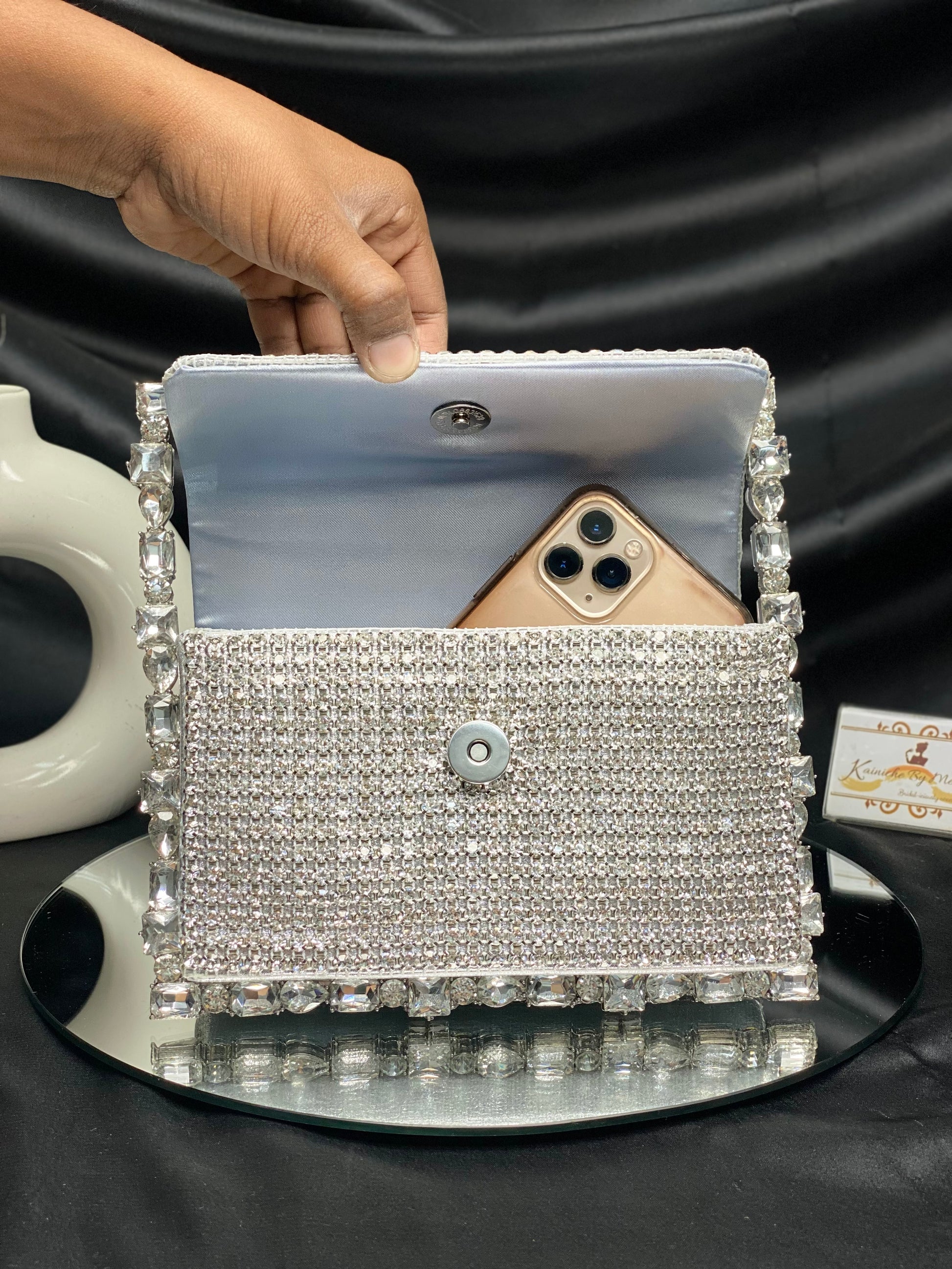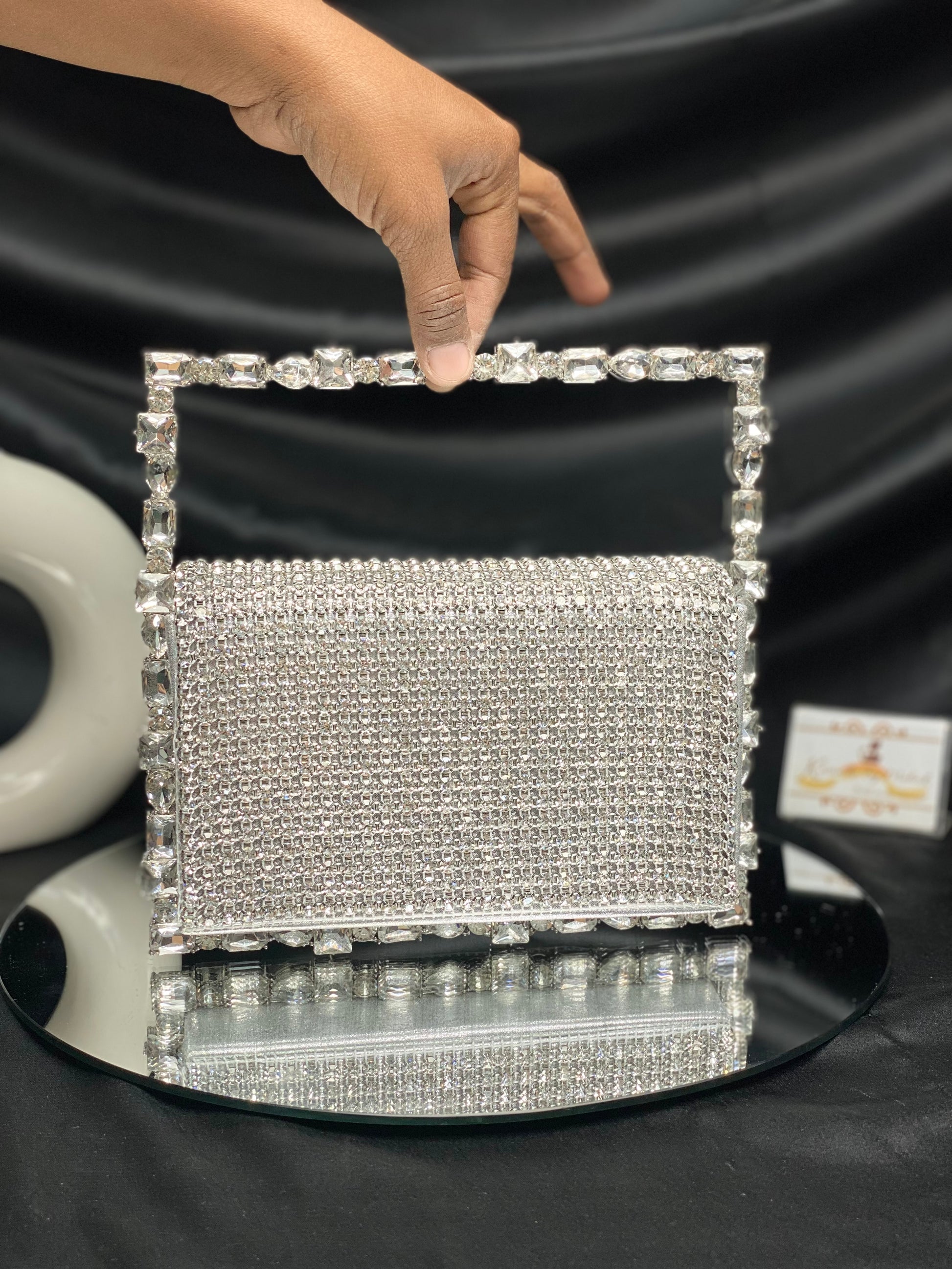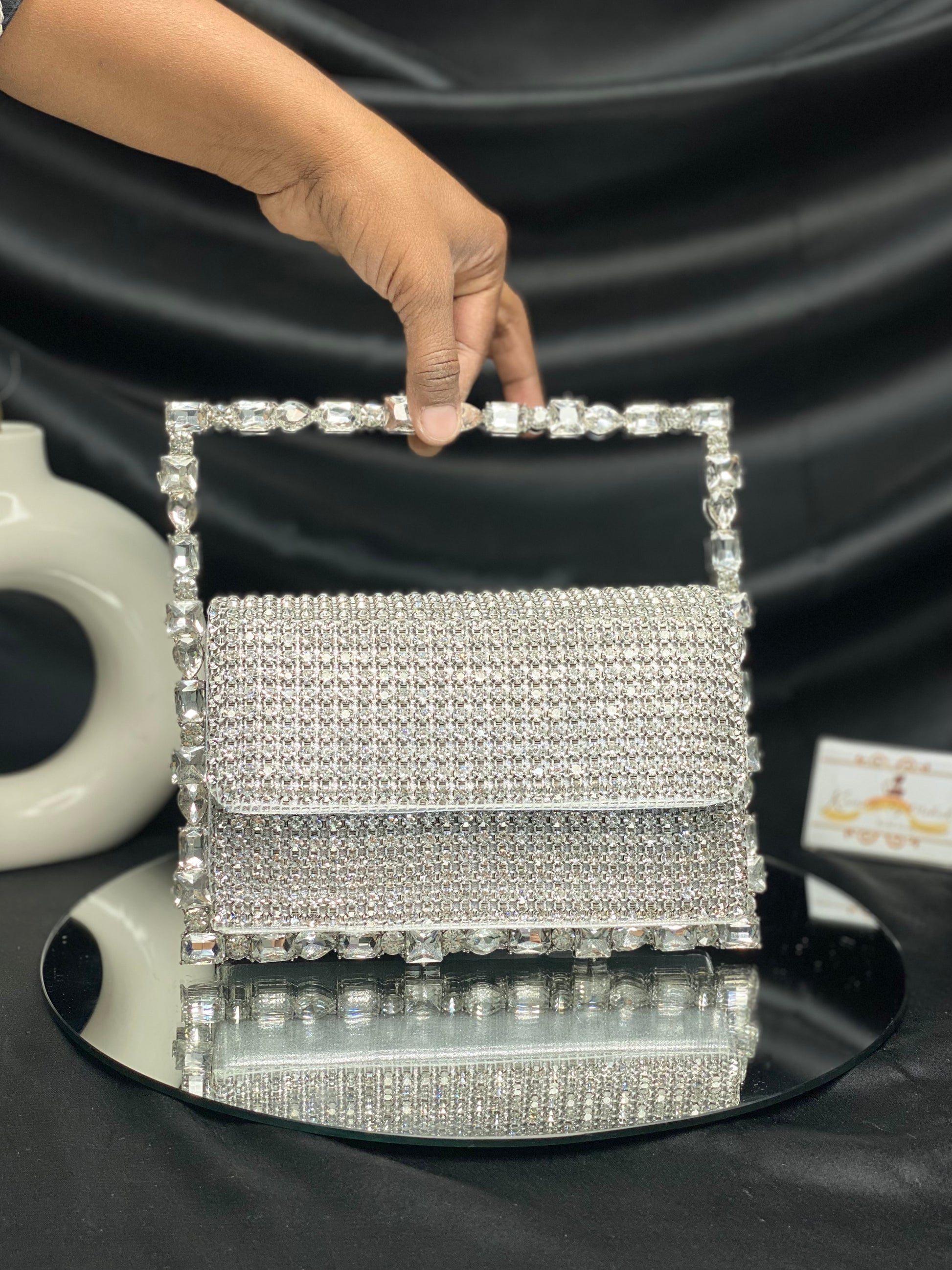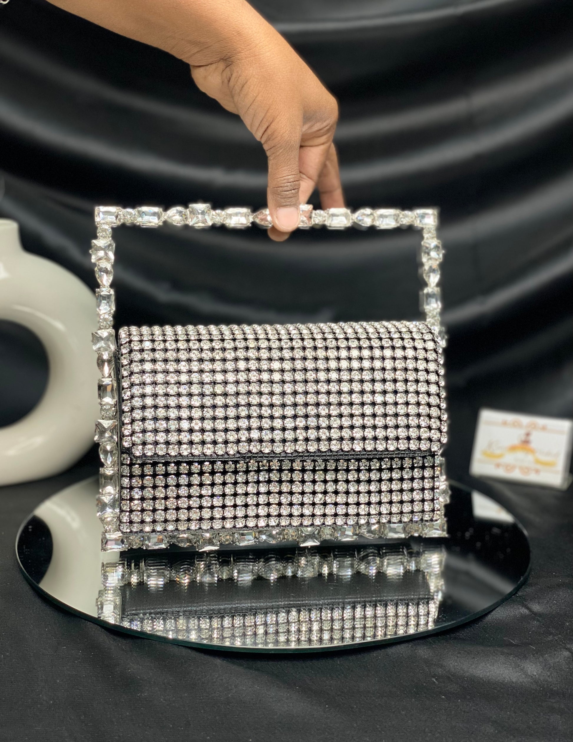 Elegance sparkles in every stitch, rhinestones whispering tales of glamour, carried by a handle adorned with diamond dreams.