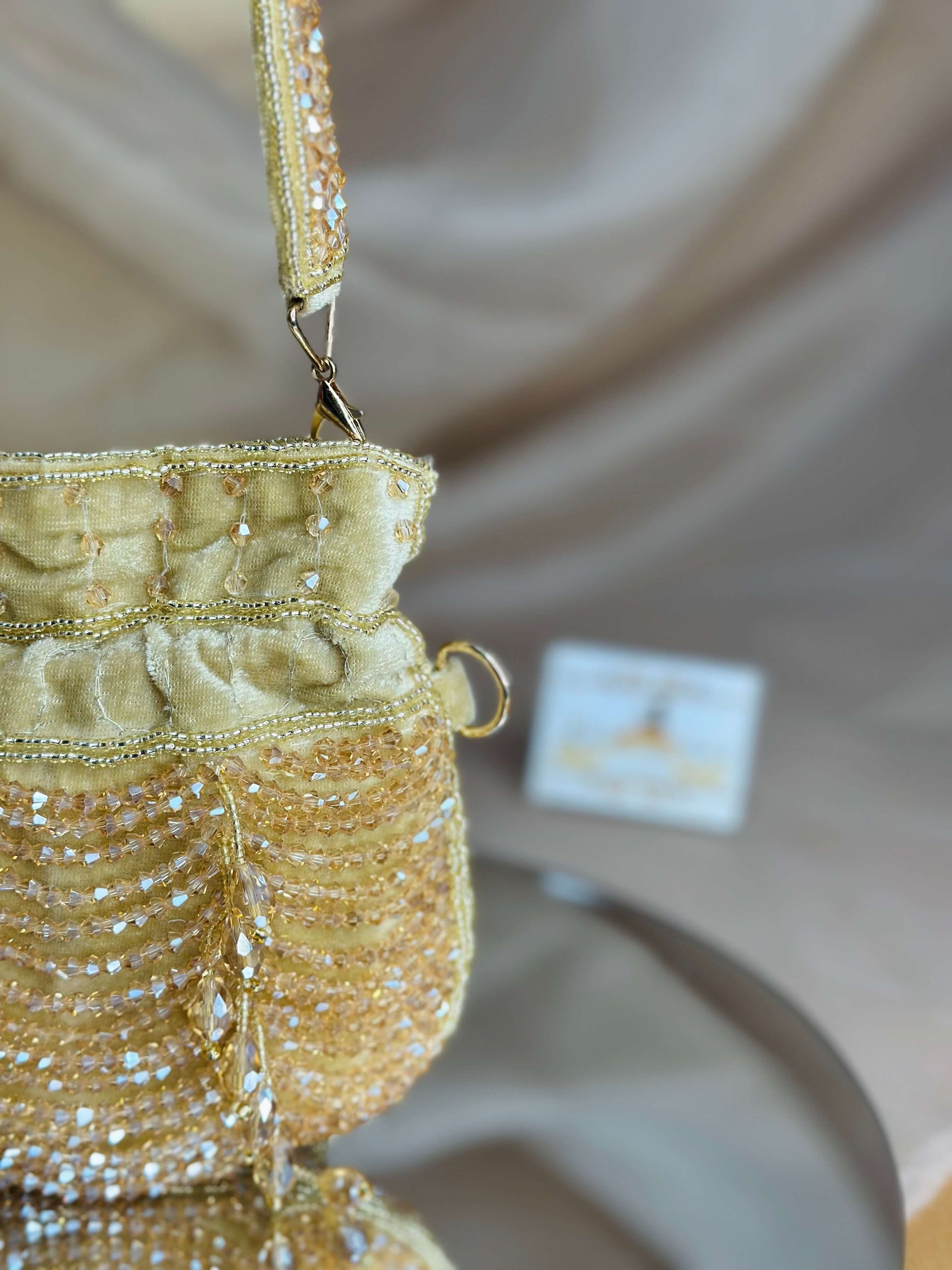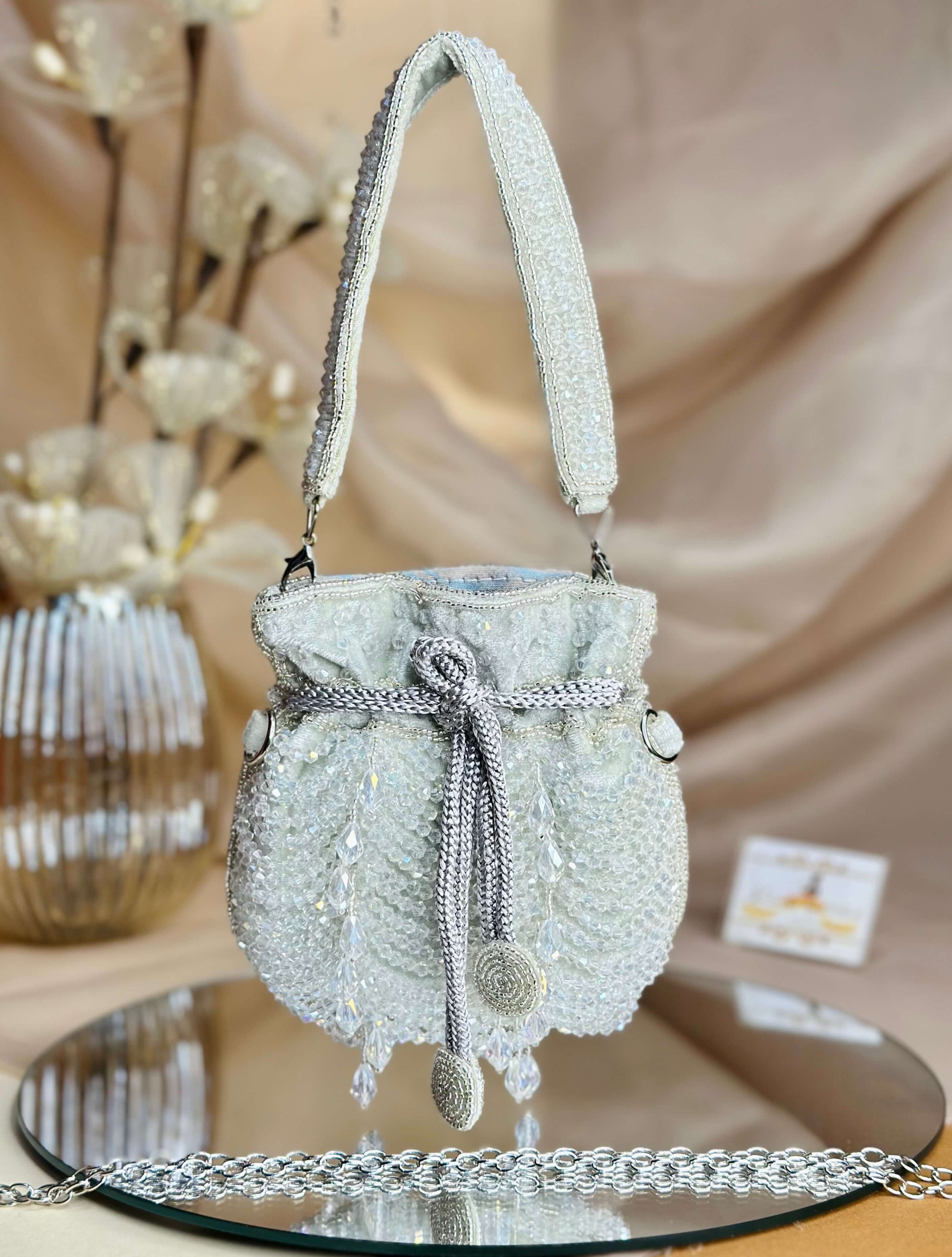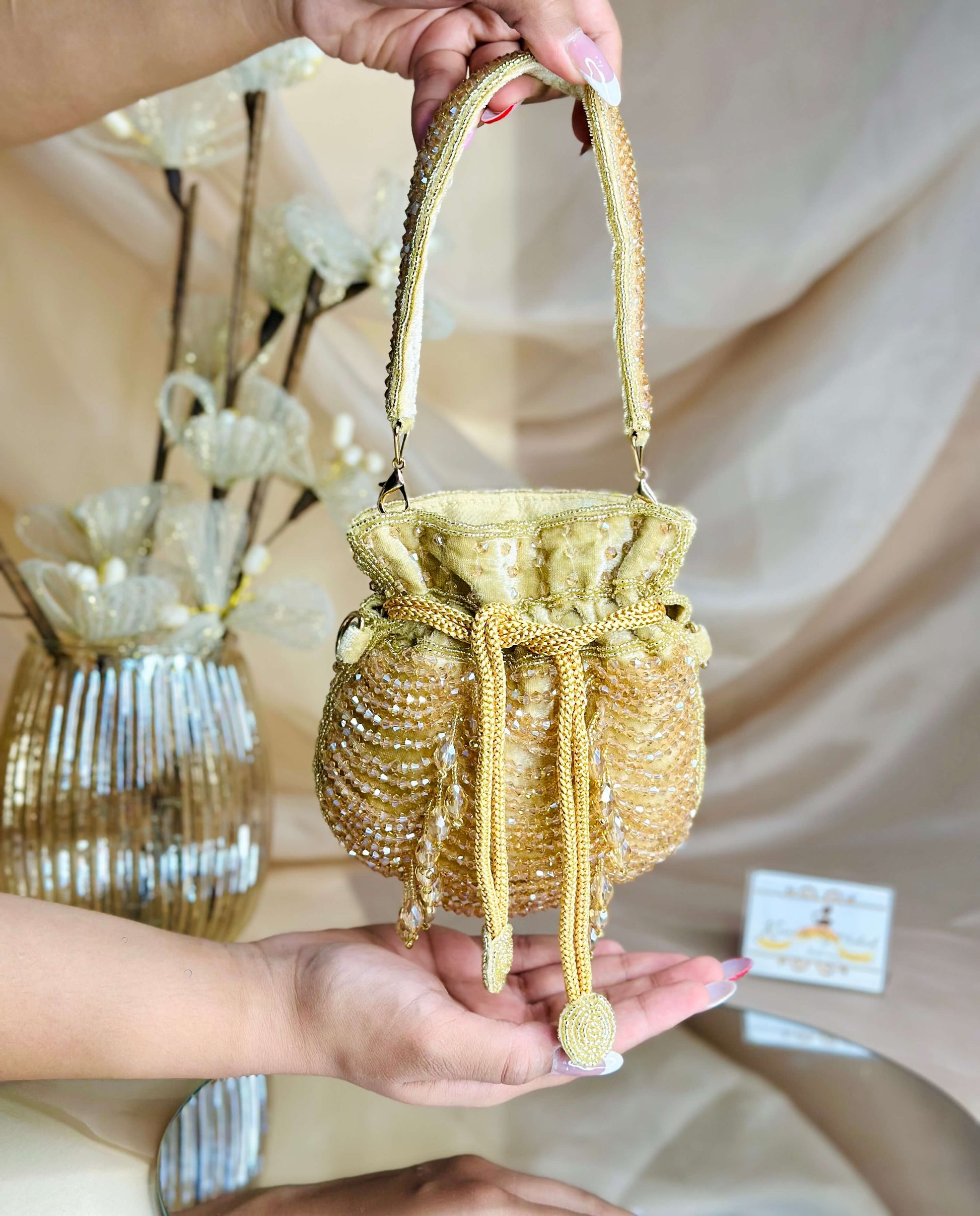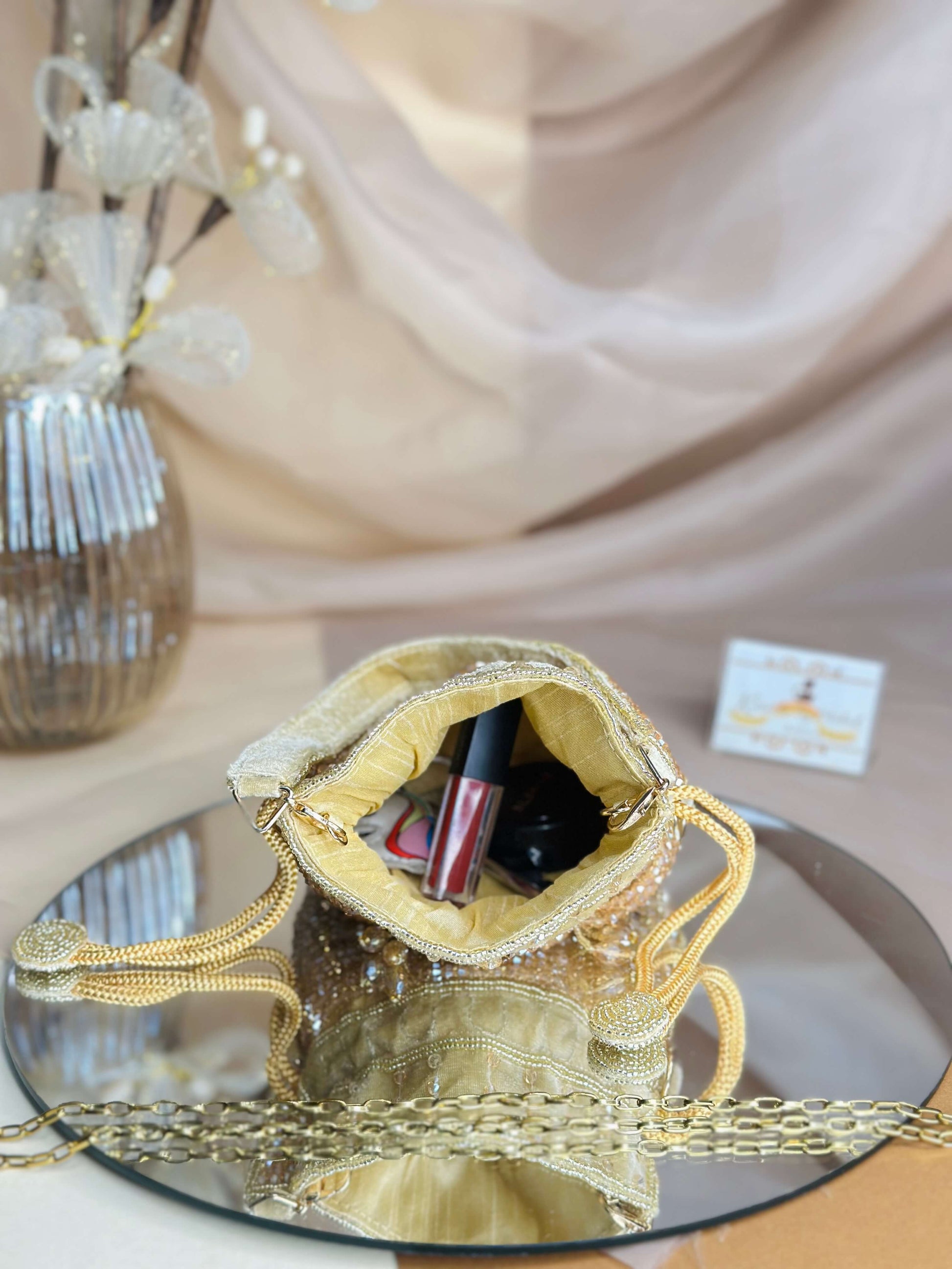 Elevate your festive look with this beautifully crafted Mini Potli, adorned with delicate stone hangings that add just the right touch of glamour and sparkle. Despite its compact size, this Potli is surprisingly spacious—perfect for carrying all your essentials like keys, cards, cash, lipstick, and more.