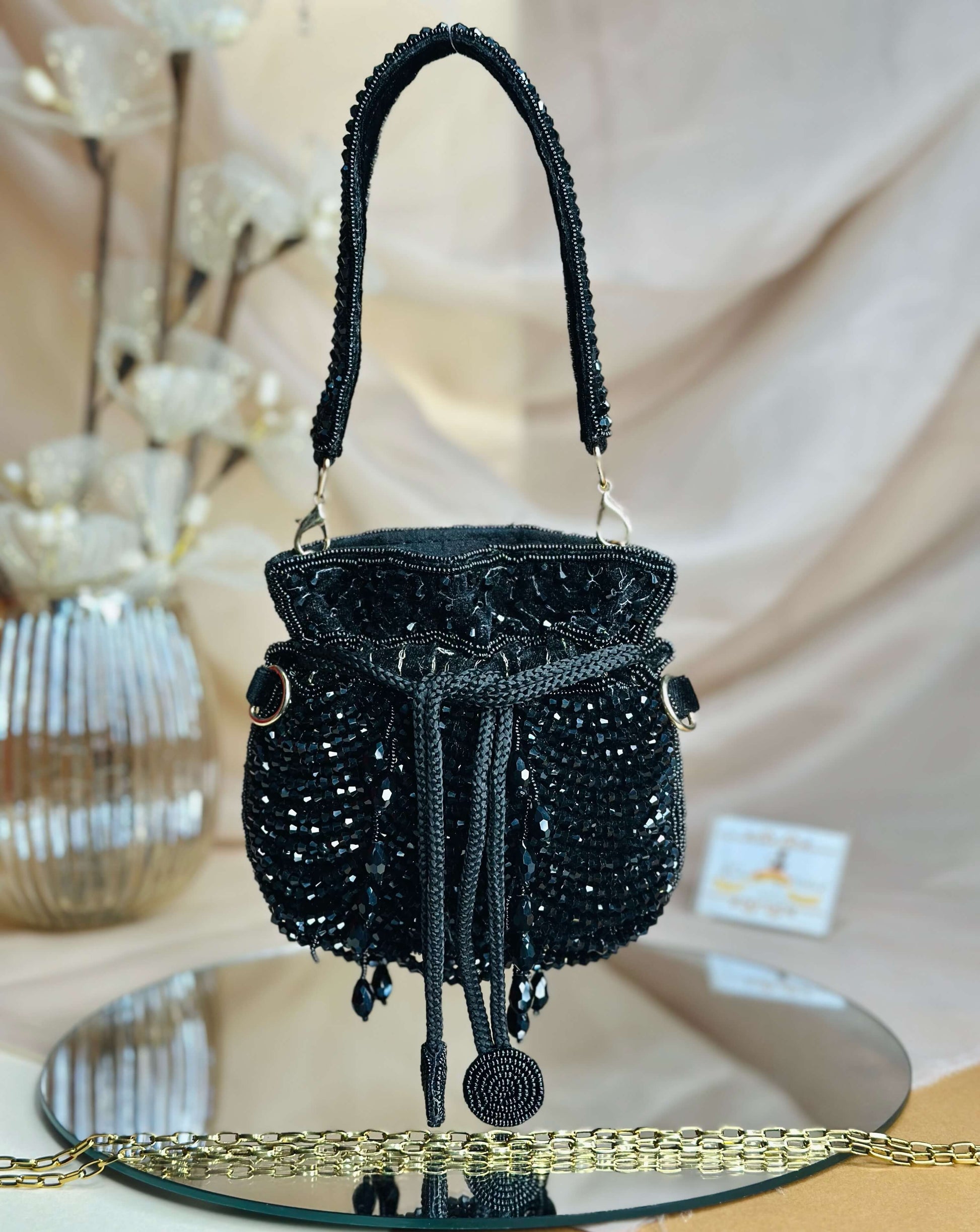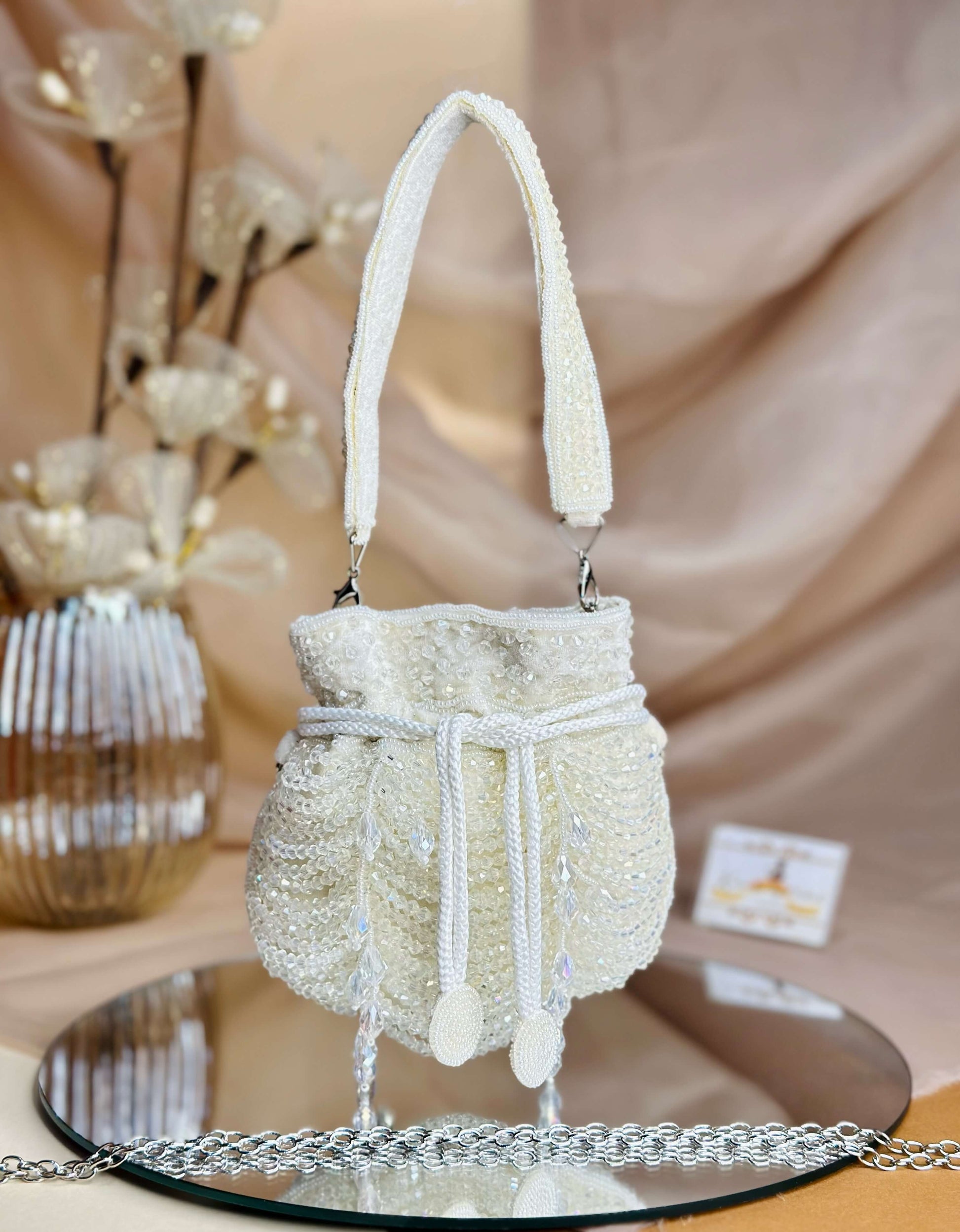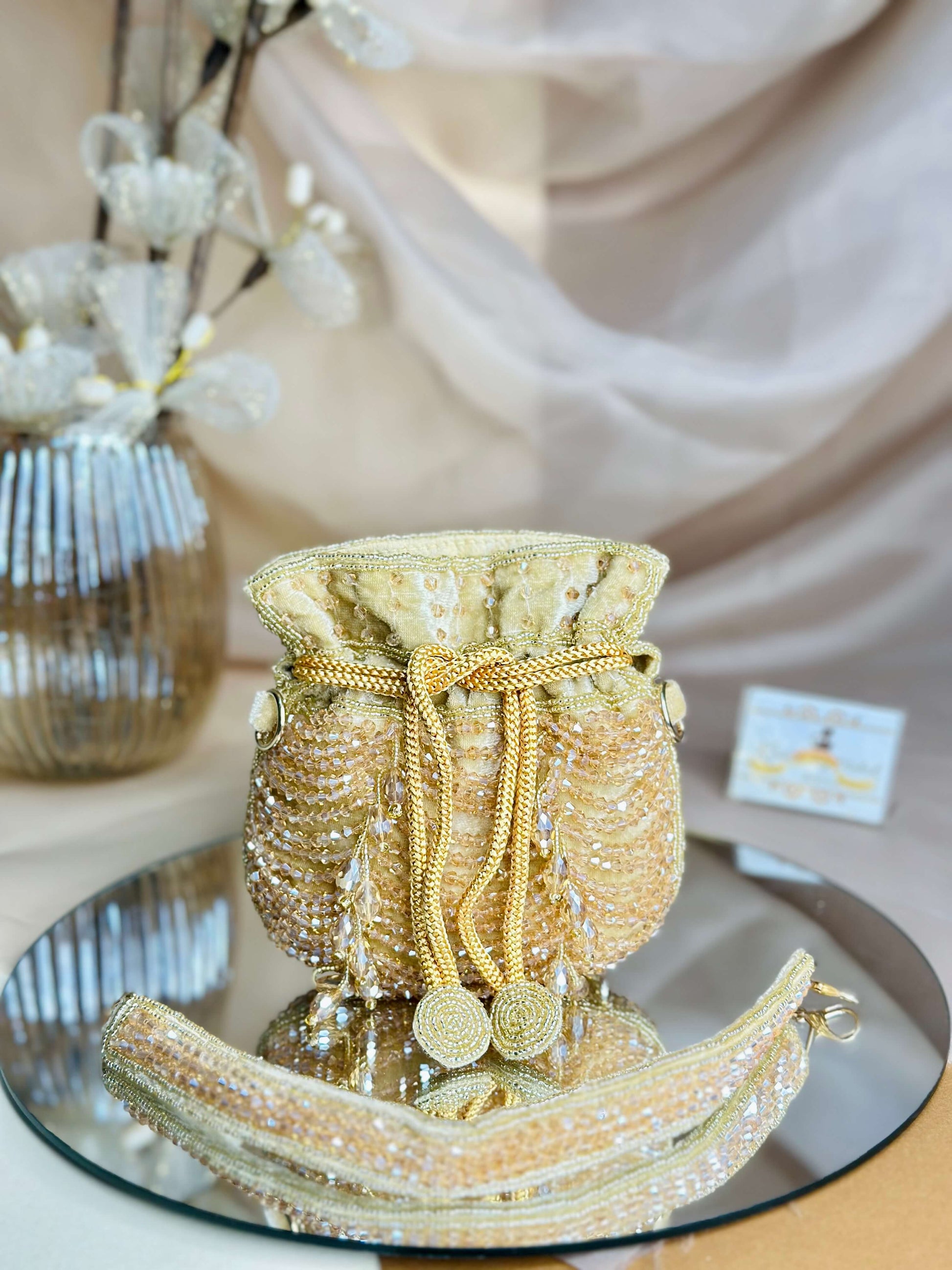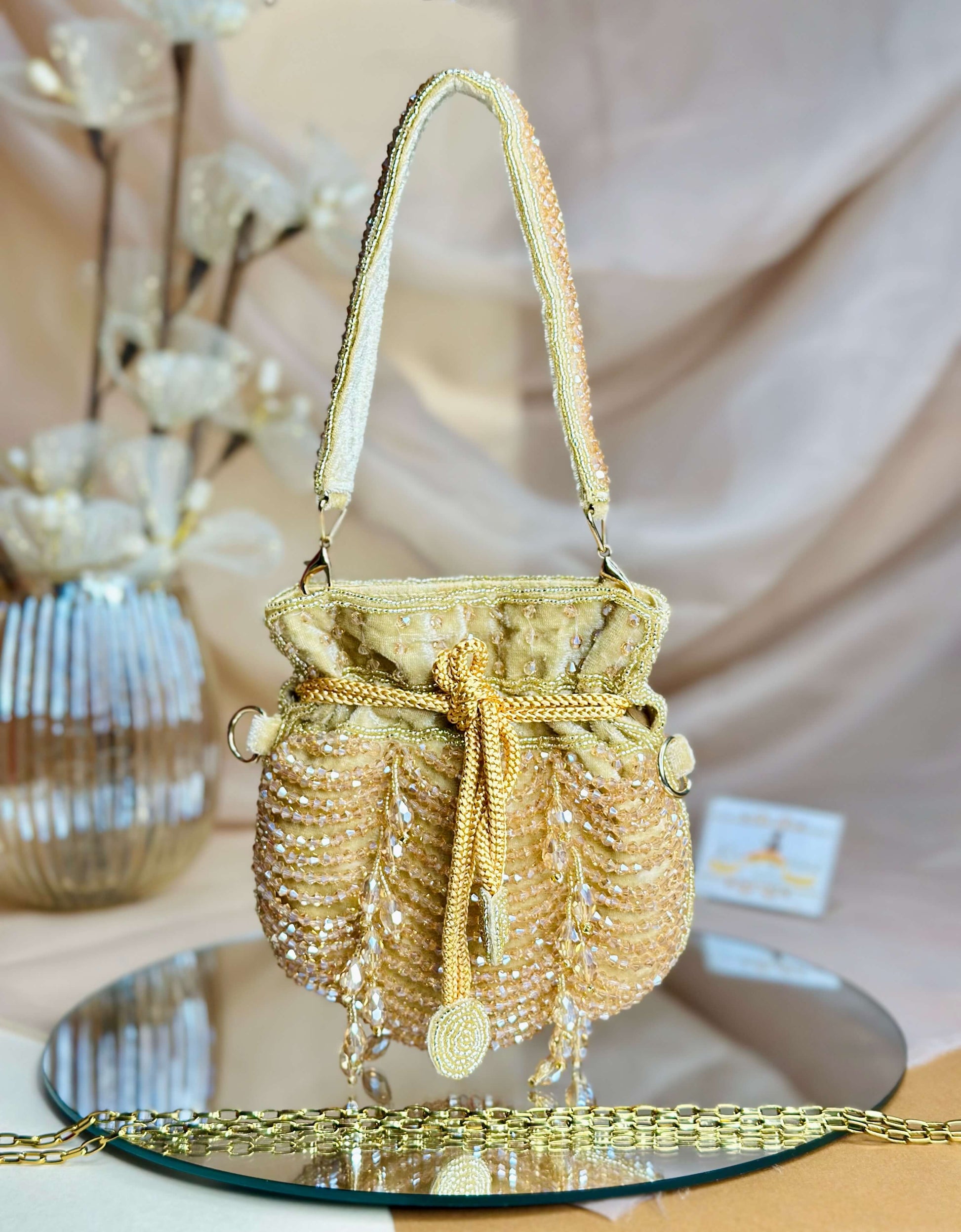 Elevate your festive look with this beautifully crafted Mini Potli, adorned with delicate stone hangings that add just the right touch of glamour and sparkle. Despite its compact size, this Potli is surprisingly spacious—perfect for carrying all your essentials like keys, cards, cash, lipstick, and more.
