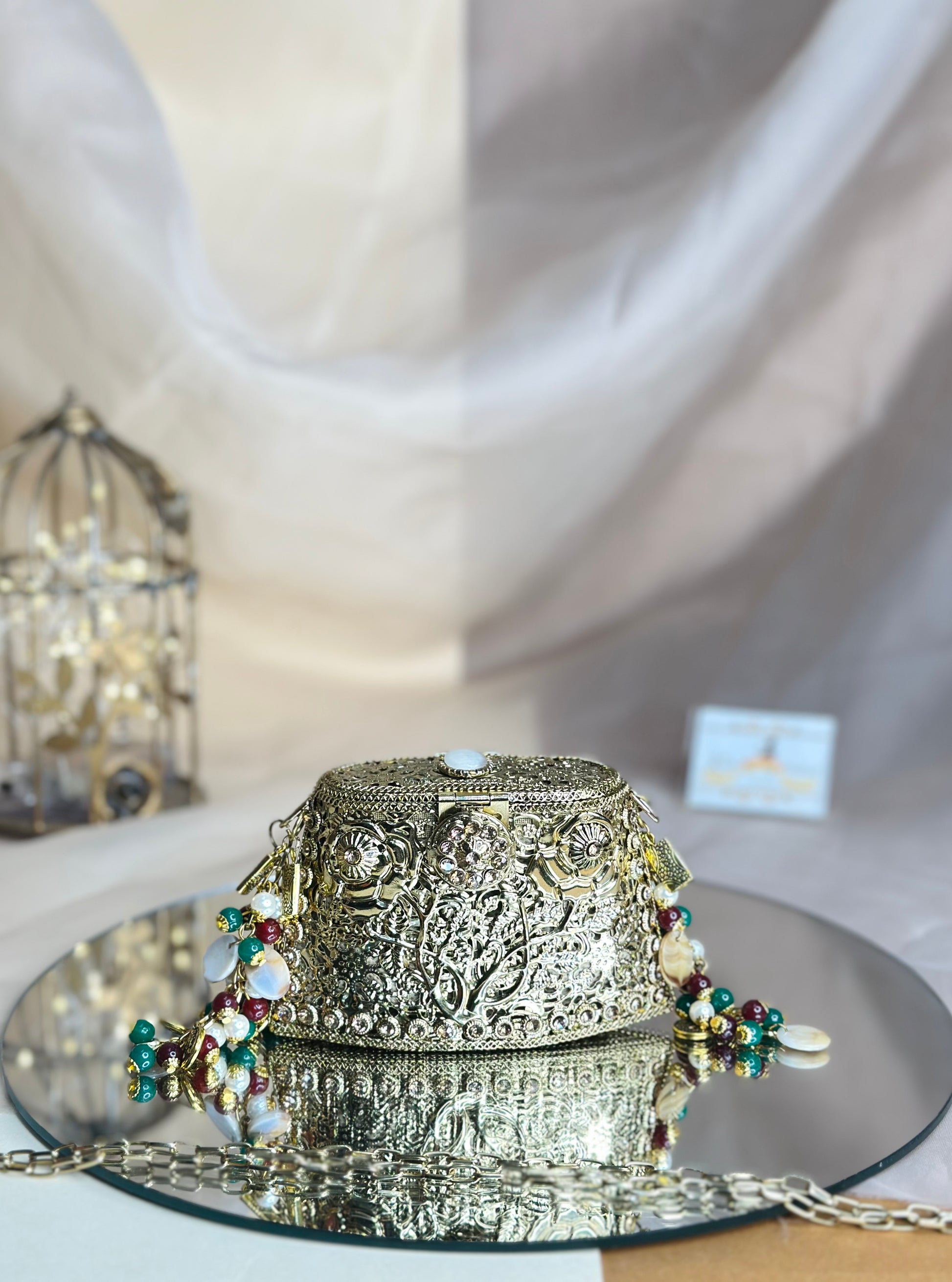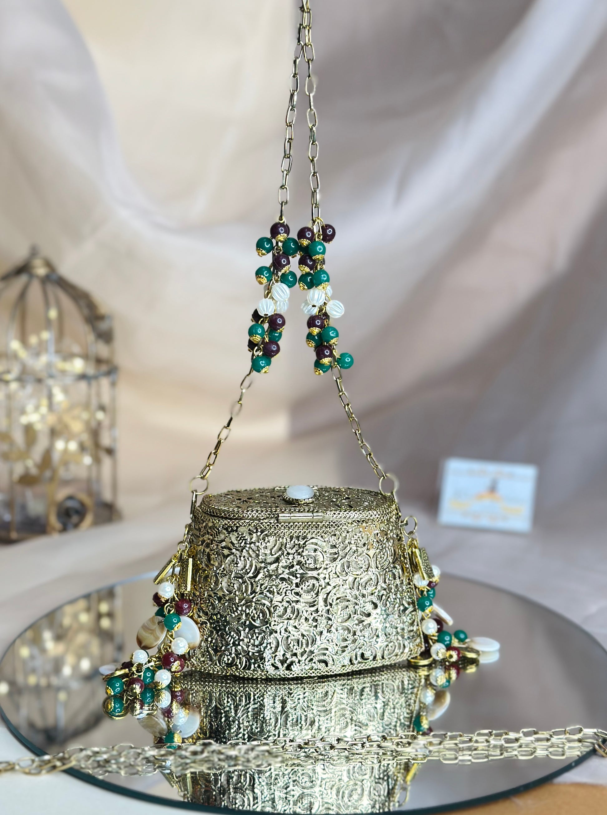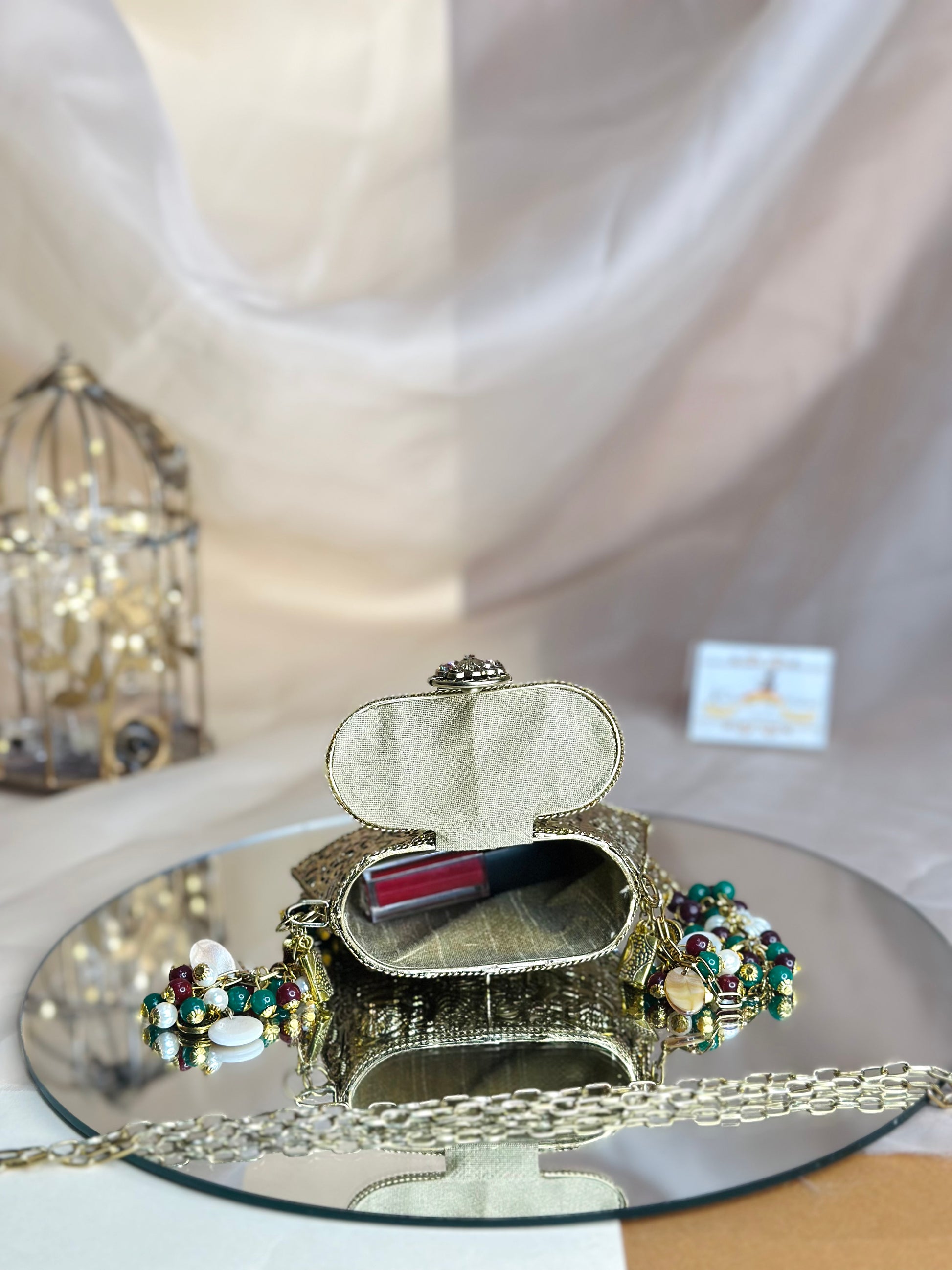 Mini Aarzoo Bag combines timeless elegance with practical sophistication. Crafted with a sturdy brass base, this compact accessory showcases premium construction designed to withstand daily use while maintaining its refined aesthetic. The vintage-inspired design brings character and depth to any ensemble, offering a distinctive alternative to contemporary styles. Perfect for those who appreciate quality craftsmanship and understated luxury, this mini bag serves as both a functional piece and a statement of refined taste.