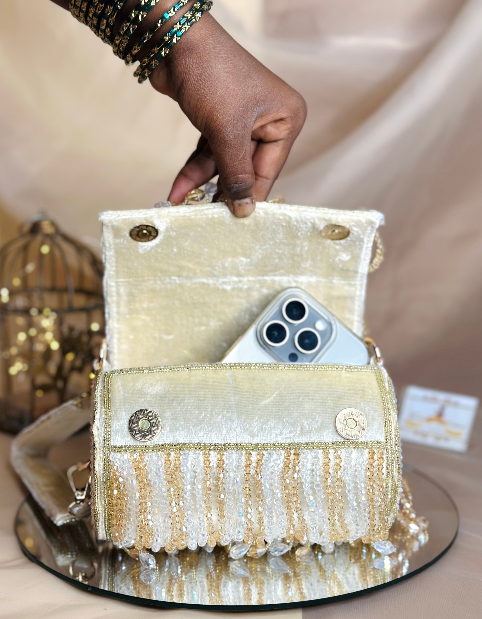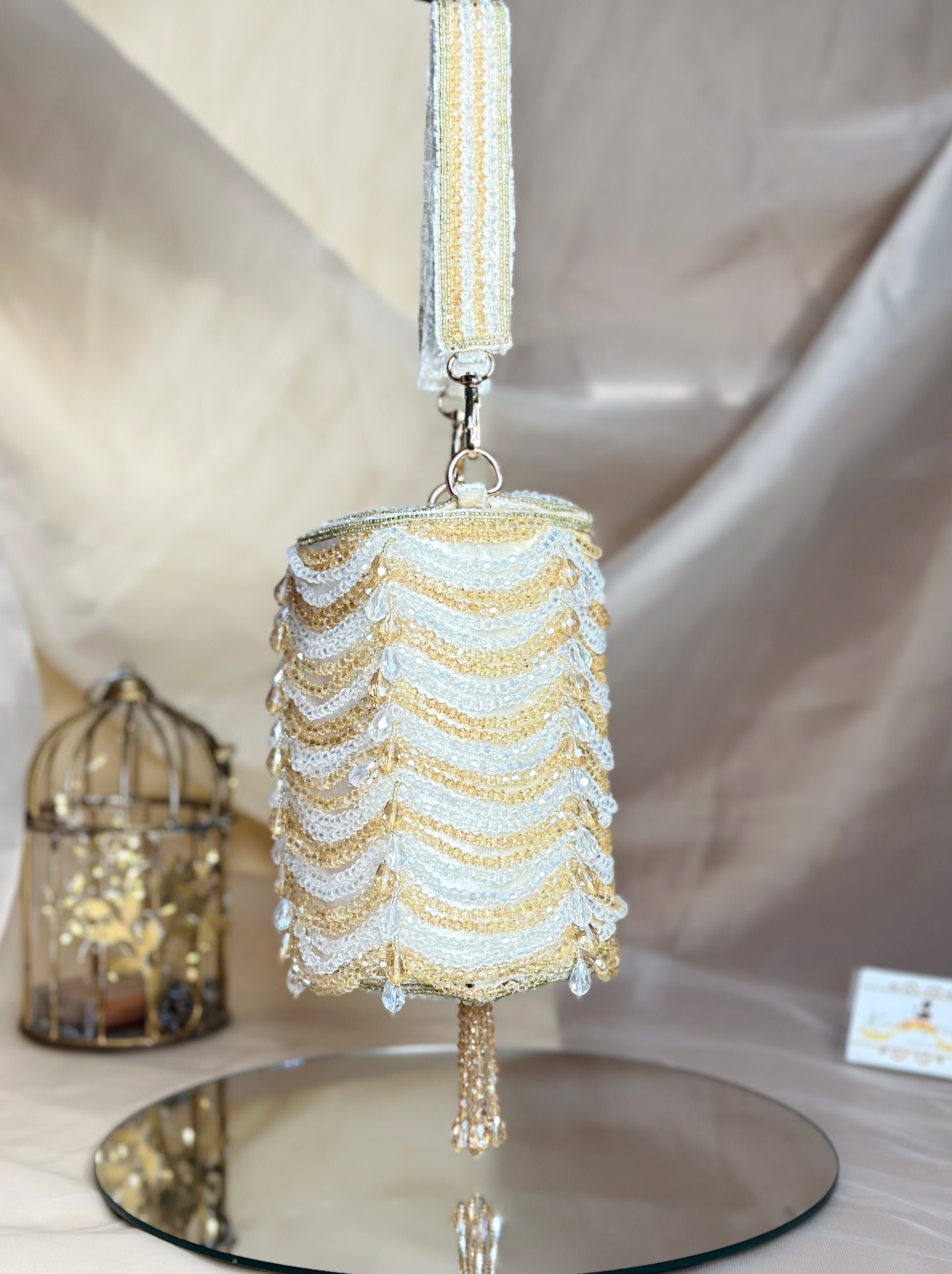 A statement handcrafted piece, the Mumtaaz Dual Bag features intricate beadwork and a versatile design that can be styled both vertically and horizontally.