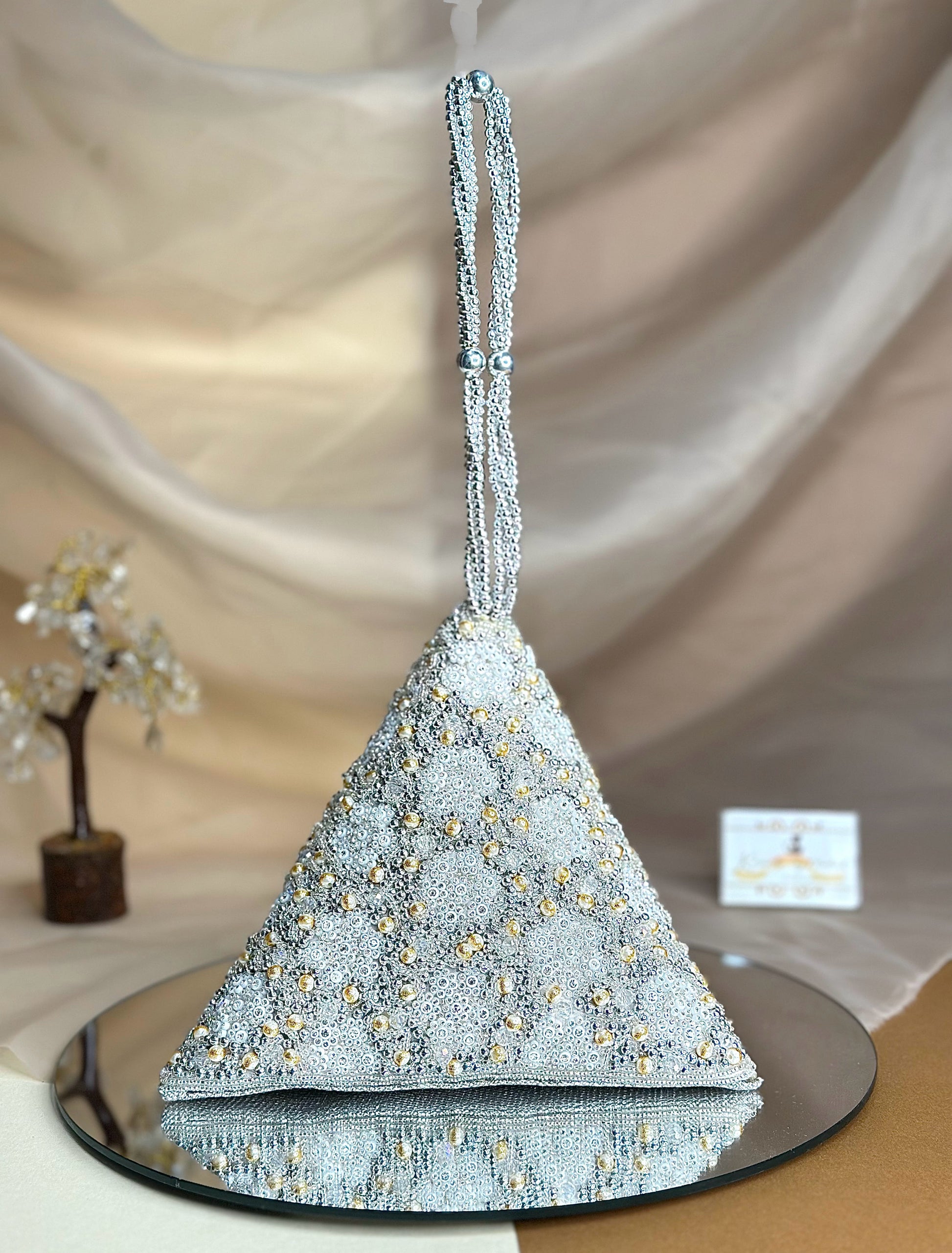 The Nitya Trigon Potli combines geometric elegance with traditional craftsmanship. Its distinctive triangle silhouette showcases intricate detailing that reflects meticulous artisanal work. Crafted from premium materials, this potli serves as both a functional accessory and a statement piece. Perfect for festive occasions or everyday sophistication, it elevates any ensemble with its refined aesthetic and thoughtful design.