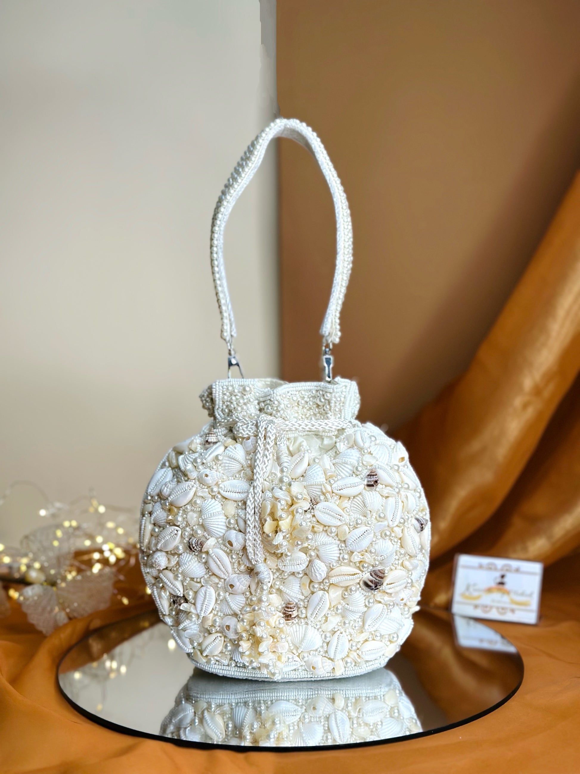 Elevate your style with the Shell Potli, a premium accessory that combines artisanal craftsmanship with a unique design inspired by natural shells. Perfect for special occasions, this potli offers both elegance and practicality, making it an exclusive addition to your collection. Its distinctive texture and refined detailing highlight its superior quality, ensuring you stand out with every use. Ideal for carrying essentials while adding a touch of sophistication to your ensemble.