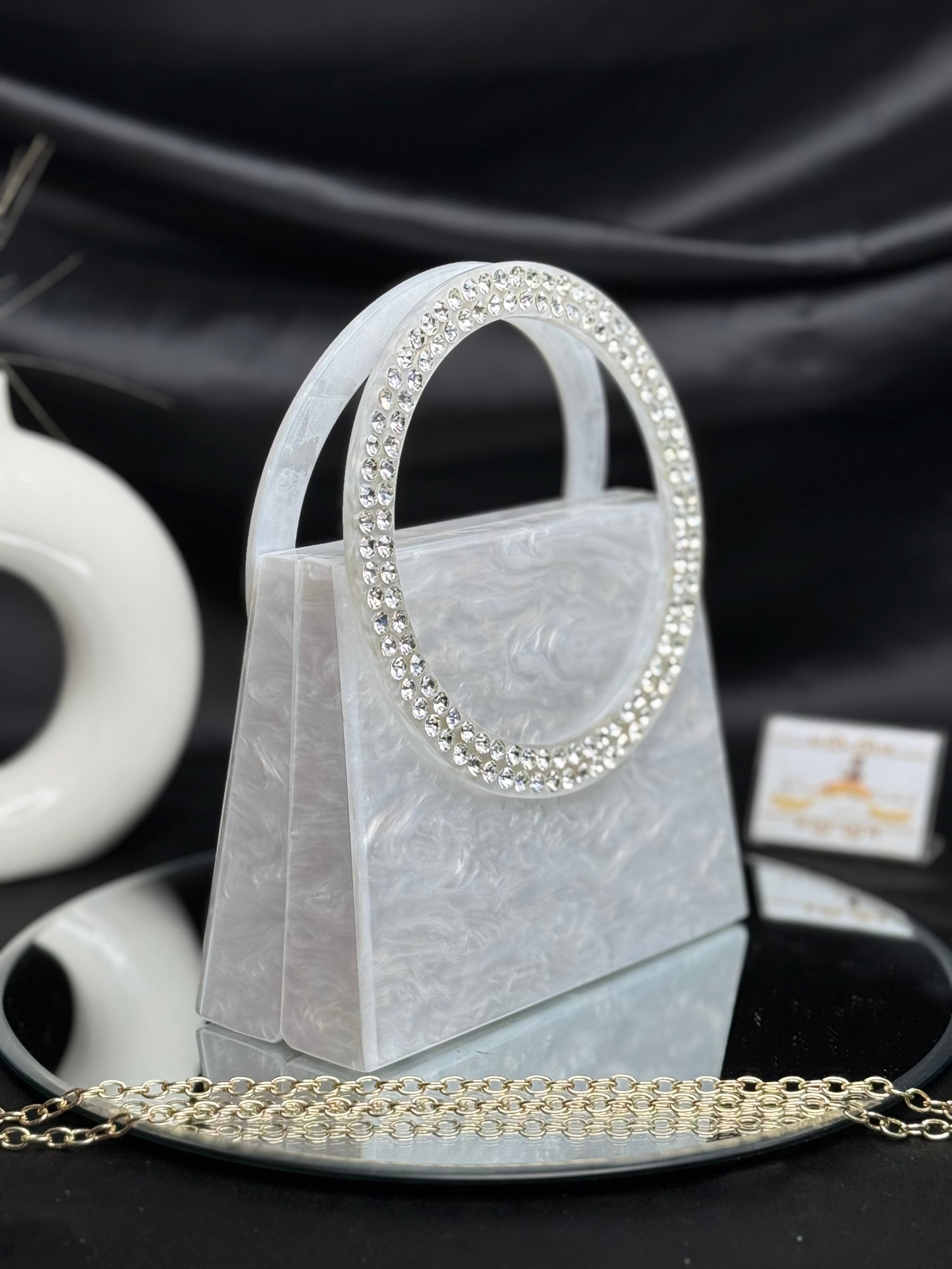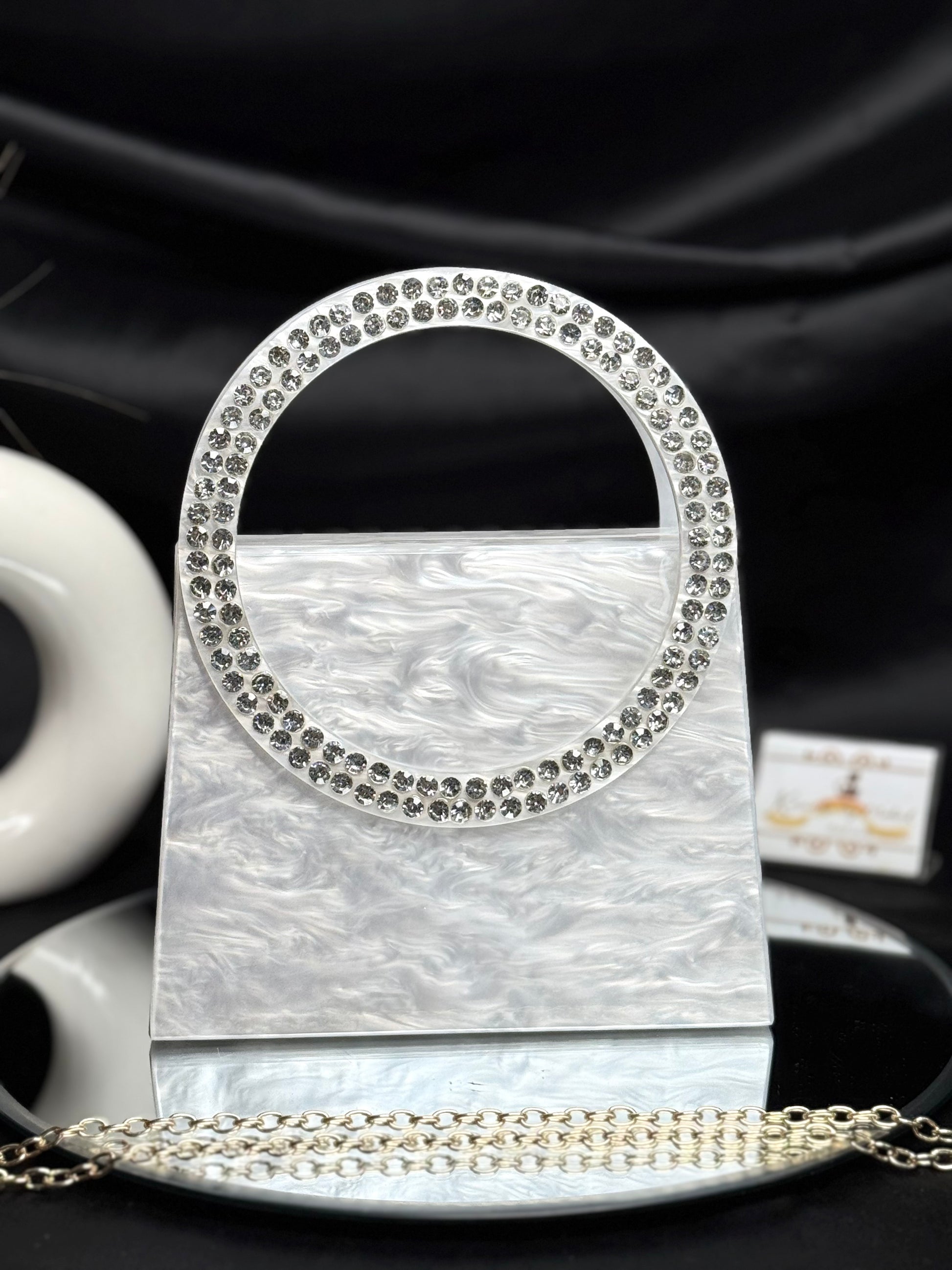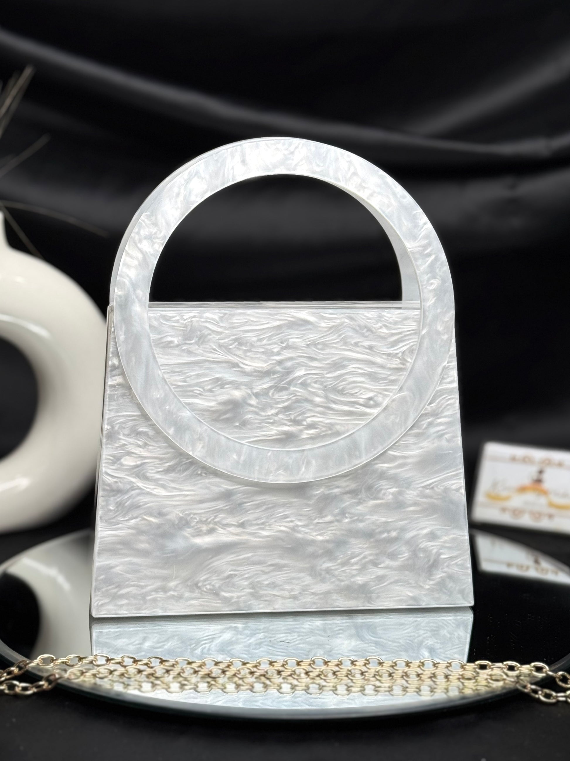The Vincent Clutch is a stylish and versatile accessory, featuring a ring handle for easy carrying. Made with a luxurious blend of mother of pearl and resin material, it exudes high-end quality. Elevate any outfit with this chic and timeless clutch.