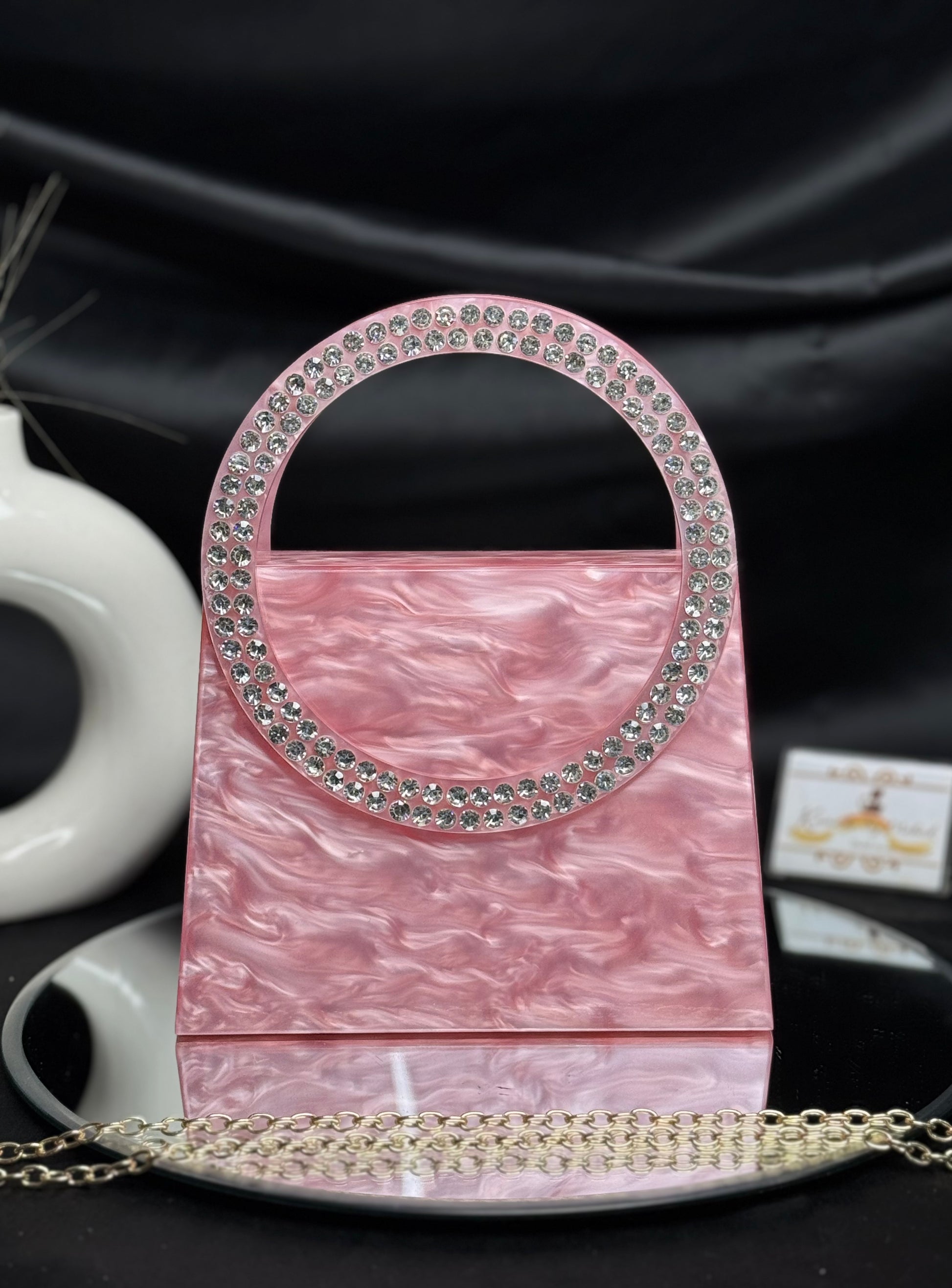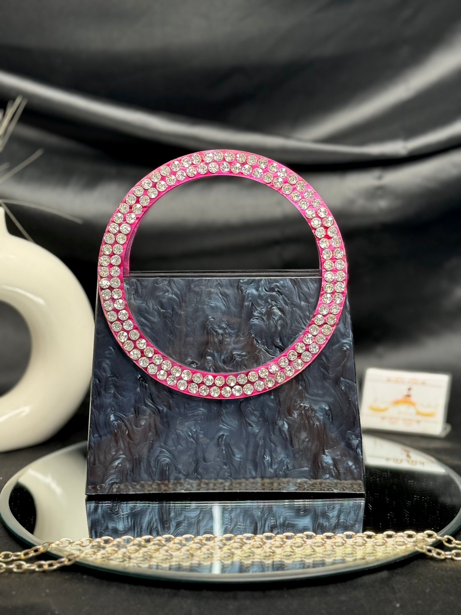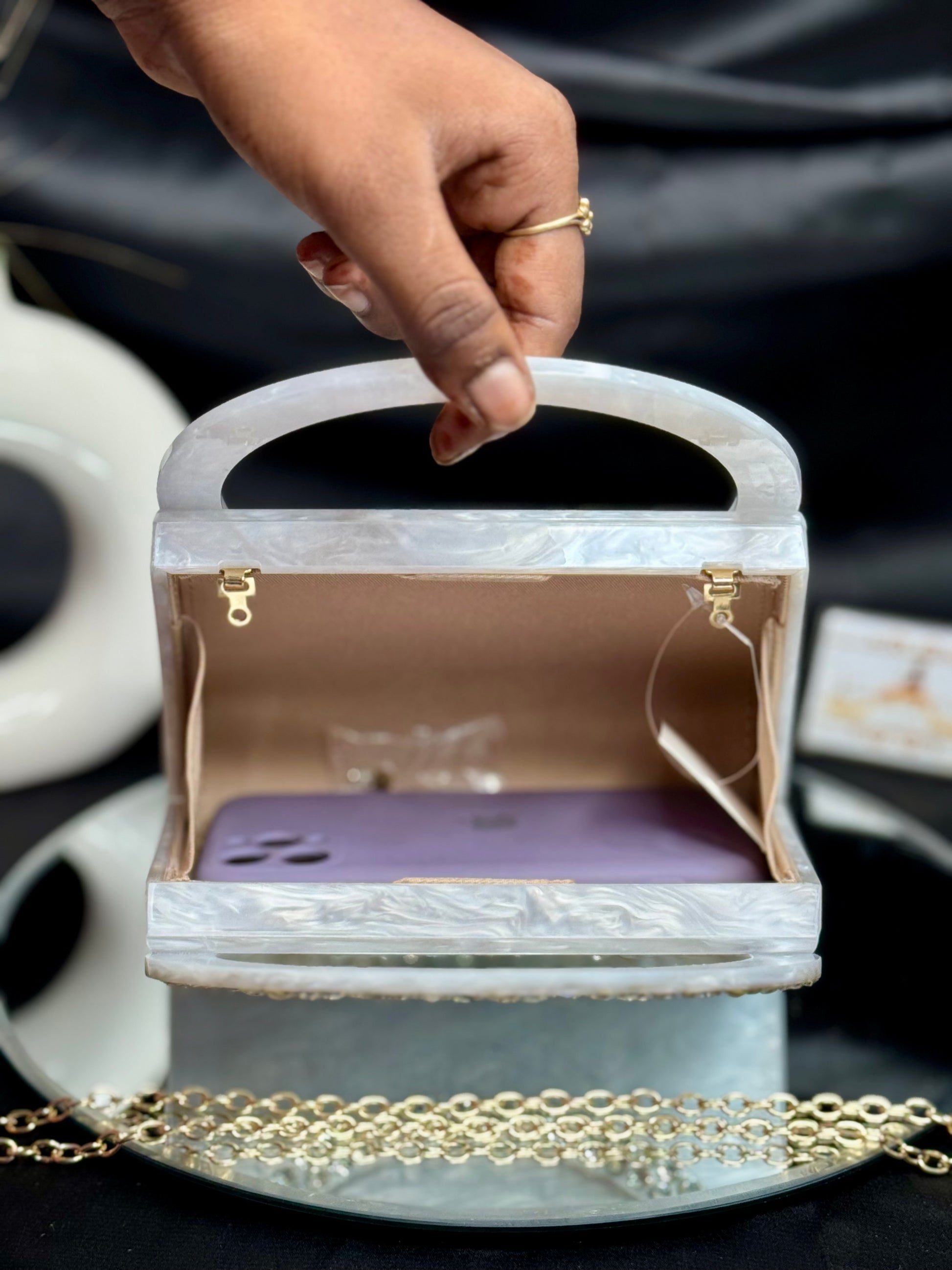 The Vincent Clutch is a stylish and versatile accessory, featuring a ring handle for easy carrying. Made with a luxurious blend of mother of pearl and resin material, it exudes high-end quality. Elevate any outfit with this chic and timeless clutch.